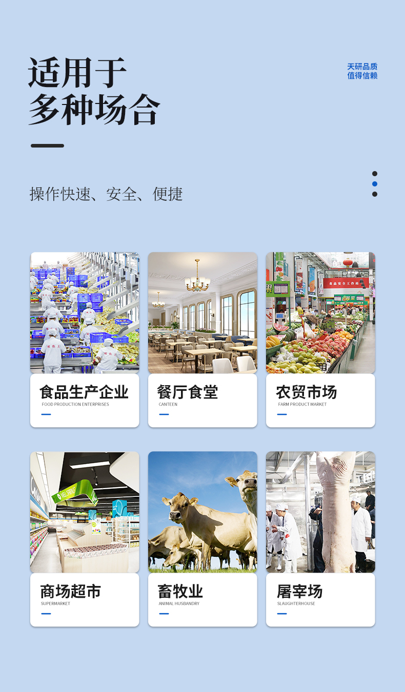 產(chǎn)品用途: 該膠體金檢測儀適用于豬、雞、鴨、羊、牛、牛奶等畜禽肉產(chǎn)品中獸藥殘留,包括抗生素類殘留、瘦肉精激素類殘留和水產(chǎn)品有毒有害物質的現(xiàn)場快速篩查定及性定量檢測。 該多功能獸藥殘留檢測儀為集成化肉品安全快速檢測分析設備,可廣泛應用于畜牧養(yǎng)殖場、屠宰場、食品肉產(chǎn)品深加工企業(yè)、食藥監(jiān)局