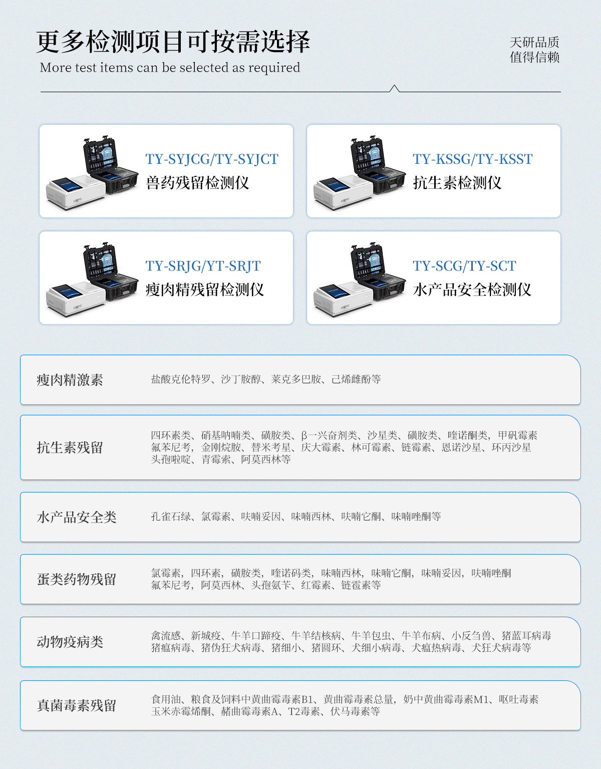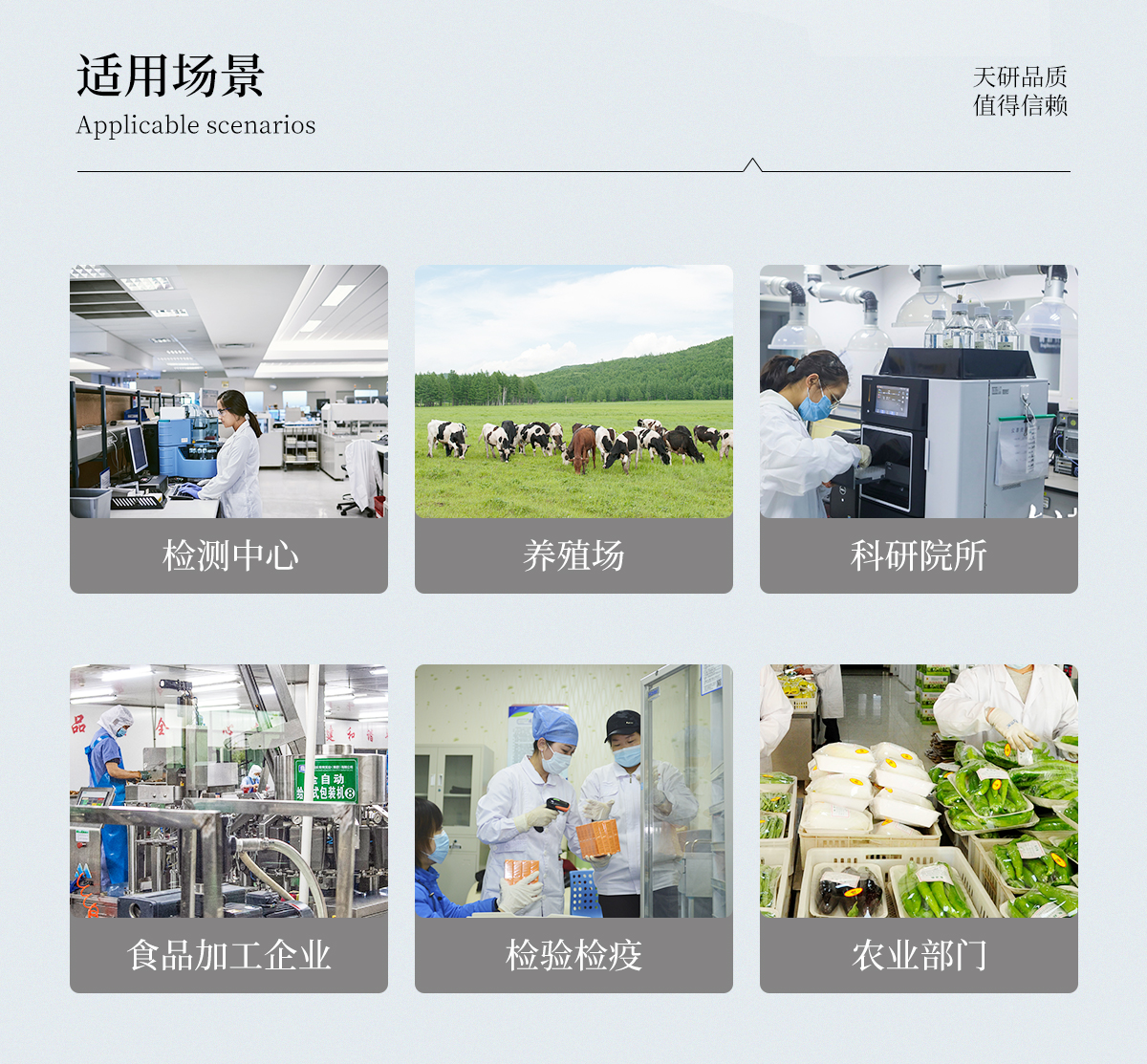 | 食品添加劑:二氧化硫、雙氧水、亞硝酸鹽、硝酸鹽、苯甲酸鈉、山梨酸鉀、糖精鈉、甜蜜素、木耳硫酸鎂等 | 有毒有害物質(zhì):甲醛、吊白塊、硼砂、過(guò)氧化苯甲酰、溴酸鉀、羅丹明B、三聚氰胺、蘇丹紅、工業(yè)堿、尿素、明礬等 | 果蔬:農(nóng)藥殘留(酶抑制率法) | 病害肉診斷:組胺、揮發(fā)性鹽基氮; | 重金屬含量:鉛、鎘、鉻、汞、砷、錫、鎳、鋁等; | 食用油脂: 過(guò)氧化值、酸價(jià)等 | 瘦肉精激素類(lèi)(獸藥):鹽酸克倫特羅、沙丁胺醇、萊克多巴胺、己烯雌酚等 | 抗生素殘留類(lèi)(獸藥):四環(huán)素類(lèi)、硝基呋喃類(lèi)、磺胺類(lèi)、β-興奮劑類(lèi)、沙星類(lèi)、磺胺類(lèi)、喹諾酮類(lèi),甲砜霉素,氟苯尼考,金剛烷胺、替米考星、慶大霉素、林可霉素、鏈霉素、恩諾沙星、環(huán)丙沙星、頭孢啦啶、青霉素、阿莫西林等 | 真菌毒素類(lèi):食用油、糧食及飼料中黃曲霉毒素B1、黃曲霉毒素總量,奶中黃曲霉毒素M1、嘔吐毒素、玉米赤霉烯酮、赭曲霉毒素A、T2毒素、伏馬毒素等; | 水酒飲品分析:酒中甲醇、乙醇、乳品及牛奶中蛋白質(zhì), | 調(diào)味品成分:食醋的總酸、醬油的總酸、芝麻油純度、谷氨酸鈉、醬油氨基酸態(tài)氮、食鹽中亞鐵氰化鉀、食鹽中碘等 | 食用色素類(lèi):紅色色素(胭脂紅、莧菜紅、赤蘚紅、誘惑紅)、黃色色素(檸檬黃、日落黃)、藍(lán)色色素(亮藍(lán))等 | 動(dòng)物疫病類(lèi):禽流感、新城疫、牛羊口蹄疫、牛羊結(jié)核病、牛羊包蟲(chóng)、牛羊布病、小反芻獸、豬藍(lán)耳病毒、豬瘟病毒、豬偽狂犬病毒、豬細(xì)小、豬圓環(huán)、犬細(xì)小病毒、犬瘟熱病毒、犬狂犬病毒等; | 蜂蜜成分:果糖和葡萄糖、蔗糖、淀粉酶、酸度等 | 水產(chǎn)品安全類(lèi):孔雀石綠、氯霉素、呋喃妥因、呋喃西林、呋喃它酮、呋喃唑酮等 | 蛋類(lèi)藥物殘留:氯霉素,四環(huán)素,磺胺類(lèi),喹諾酮類(lèi),呋喃西林,呋喃它酮,呋喃妥因,呋喃唑酮,氟苯尼考,阿莫西林、頭孢氨芐、紅霉素、鏈霉素等 |