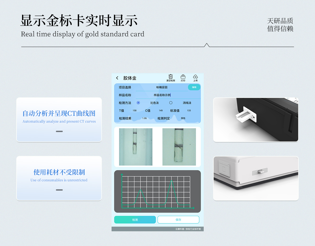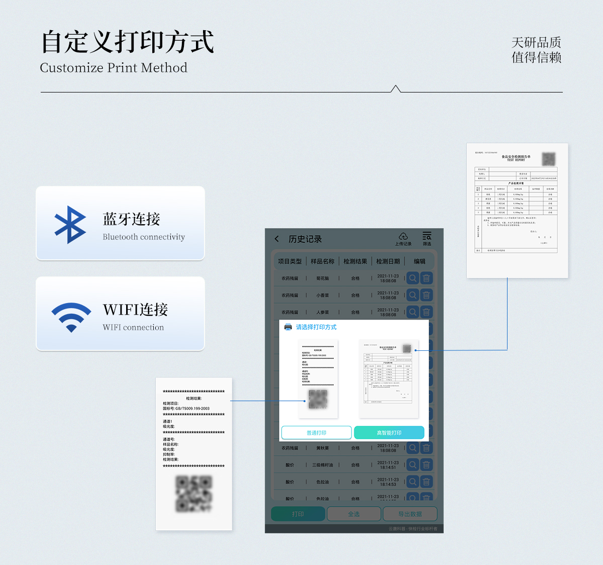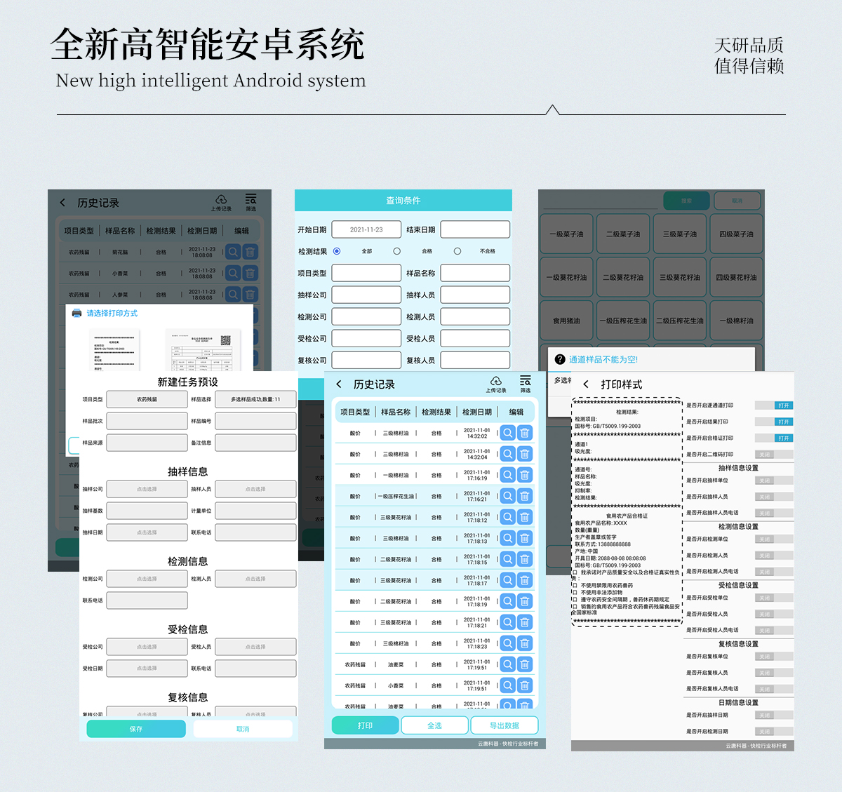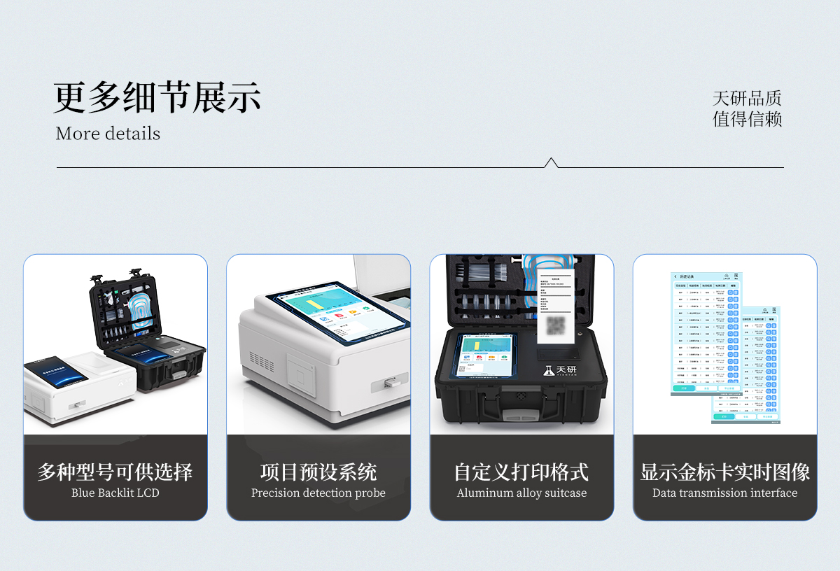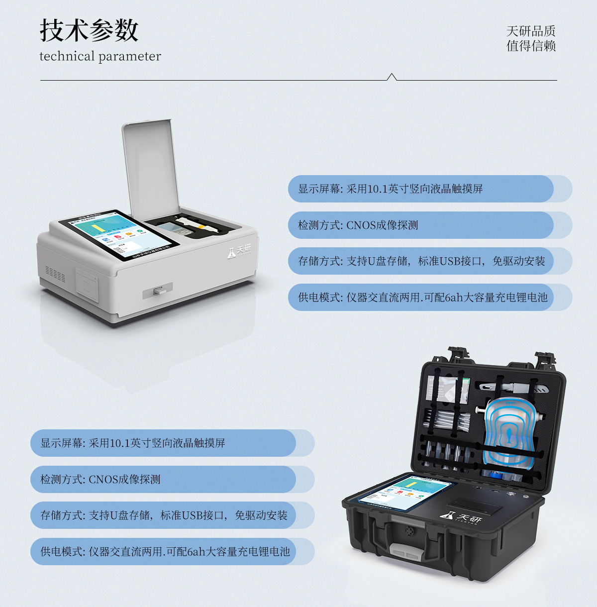| 儀器采用手提一體化系統(tǒng)檢測(cè)技術(shù),將分光光度模塊、膠體金檢測(cè)模塊、新型農(nóng)殘檢測(cè)模塊、數(shù)字化管理模塊、無(wú)線通訊模塊高度集成于一體,支持檢測(cè)200種食品安全檢測(cè)項(xiàng)目,同時(shí)預(yù)留升級(jí)檢測(cè)方法。 | 儀器檢測(cè)模塊標(biāo)準(zhǔn)化、智能化,檢測(cè)項(xiàng)目可隨意自由組合。檢測(cè)箱體內(nèi)置多個(gè)標(biāo)準(zhǔn)檢測(cè)單元,檢測(cè)模塊可以調(diào)整配置。 | 顯示屏幕:儀器采用10.1英寸豎向液晶觸摸屏顯,搭配運(yùn)行安卓智能操作系統(tǒng),主控芯片采用ARM Cortex-A7,RK3288/4核處理器,主頻1.88Ghz,操作方便,性能更強(qiáng)。 | 檢測(cè)通道:≥12通道;采用精密旋轉(zhuǎn)比色池設(shè)計(jì),使用同芯片同光源校準(zhǔn)精度,解決不同光源之間的誤差值,更加準(zhǔn)確**。(1-12通道間誤差0.1%,**號(hào):ZL202022821055.2) | 儀器光源:高精度進(jìn)口四波長(zhǎng)冷光源,每個(gè)通道均配置 410、520、590、630nm 波長(zhǎng)光源,標(biāo)配**的光路切換裝置,**光路切換功能可實(shí)現(xiàn)64波長(zhǎng),并且所有檢測(cè)項(xiàng)目可實(shí)現(xiàn)所有通道同時(shí)檢測(cè)。 | 設(shè)備可一鍵校準(zhǔn),自動(dòng)保存校準(zhǔn)數(shù)據(jù),自動(dòng)對(duì)比校驗(yàn),得到精準(zhǔn)光源,采用Android SP存儲(chǔ)數(shù)據(jù),光源數(shù)據(jù)永不丟失,方便每一次使用。 | 通訊接口:配備無(wú)線通信模塊、4G(APN)通訊模塊、藍(lán)牙傳輸,同時(shí)具有雙USB接口以及RJ45網(wǎng)線接口,可以多方式實(shí)現(xiàn)數(shù)據(jù)保存及數(shù)據(jù)傳輸。 | 存儲(chǔ)方式:支持U盤(pán)存儲(chǔ),標(biāo)準(zhǔn)USB接口,免驅(qū)動(dòng)安裝。檢測(cè)結(jié)果存儲(chǔ)容量20萬(wàn)條以上,可生成Excel表格進(jìn)行拷貝,并具有登錄保護(hù)功能。 | 智能化操作系統(tǒng):: ★操作系統(tǒng):儀器可在同一檢測(cè)界面自動(dòng)對(duì)應(yīng)相關(guān)檢測(cè)通道,一次性選擇1-12個(gè)樣品名稱(chēng),無(wú)需退出界面,節(jié)省操作時(shí)間。并可以對(duì)每個(gè)通道屬性和樣品信息單獨(dú)進(jìn)行編輯,例如送檢單位、人員,檢測(cè)人員等,打印時(shí)勾選打印顯示。 | ★數(shù)據(jù)集成系統(tǒng):設(shè)備首頁(yè)自動(dòng)匯總分析檢測(cè)數(shù)據(jù),包含:周檢測(cè)數(shù)據(jù)、月檢測(cè)數(shù)據(jù),全部檢測(cè)總數(shù)量,均包含檢測(cè)總數(shù),合格數(shù),不合格數(shù),以及相關(guān)柱形分析圖,各項(xiàng)檢測(cè)數(shù)據(jù)一目了然,無(wú)需電腦查詢(xún),更加快捷直觀。 | ★數(shù)據(jù)庫(kù)系統(tǒng):十幾項(xiàng)數(shù)據(jù)庫(kù)分類(lèi)管理儀器:包含項(xiàng)目類(lèi)型、項(xiàng)目數(shù)據(jù)、檢測(cè)數(shù)據(jù)、歷史記錄、國(guó)標(biāo)信息、曲線信息、采樣信息、檢測(cè)信息、受檢信息、復(fù)核信息、圖表信息、光源校準(zhǔn)信息、打印樣式信息、樣品庫(kù)信息等等,數(shù)據(jù)庫(kù)之間互相協(xié)調(diào)聯(lián)動(dòng)保證數(shù)據(jù)的真實(shí)完整性。同時(shí)產(chǎn)品數(shù)據(jù)庫(kù)以及歷史檢測(cè)記錄支持一鍵檢索功能。 | ★限量規(guī)判系統(tǒng):具有限量查詢(xún)、添加物質(zhì)合規(guī)判定系統(tǒng)。檢測(cè)出結(jié)果后,系統(tǒng)自動(dòng)調(diào)用系統(tǒng)數(shù)據(jù)庫(kù)中相關(guān)國(guó)標(biāo)進(jìn)行比對(duì)判定,客觀顯示判定結(jié)果是否合格 | ★項(xiàng)目預(yù)設(shè)系統(tǒng):儀器具有任務(wù)預(yù)設(shè)模塊,一鍵提前預(yù)設(shè),給出方便快捷的新檢測(cè)方案,每一個(gè)任務(wù)分別可以設(shè)置不同的樣品、批次、編號(hào)、來(lái)源、備注、抽樣信息、檢測(cè)信息、受檢信息、復(fù)核信息等更多信息。樣品送檢時(shí)一鍵調(diào)取保存信息,并可多次調(diào)取,大大提高檢測(cè)效率。 | ★數(shù)據(jù)監(jiān)管系統(tǒng):同步對(duì)接監(jiān)管平臺(tái),數(shù)據(jù)可局域網(wǎng)和互聯(lián)網(wǎng)數(shù)據(jù)上傳,檢測(cè)結(jié)果可選擇直接傳至食品安全監(jiān)管平臺(tái)。進(jìn)行區(qū)域食品安全監(jiān)管及大數(shù)據(jù)分析處理與數(shù)據(jù)統(tǒng)計(jì),檢測(cè)區(qū)域食品安全長(zhǎng)短期動(dòng)態(tài),達(dá)到食品安全問(wèn)題預(yù)估、預(yù)警。 | ★打印系統(tǒng):內(nèi)置全新打印機(jī),新創(chuàng)自定義打印方式,可按需靈活勾選控制:產(chǎn)品合格證(國(guó)家農(nóng)業(yè)部標(biāo)準(zhǔn)要求),二維碼,抽樣信息、檢測(cè)信息,受檢信息、復(fù)核信息、抽樣日期、檢測(cè)日期等信息的打印。 | 供電模式:儀器交直流兩用,直流12V供電,可連接車(chē)載電源,可配6ah大容量充電鋰電池,電量可實(shí)時(shí)顯示,方便戶(hù)外流動(dòng)測(cè)試。 | 膠體金檢測(cè)模塊:采用雙通道CMOS成像處理技術(shù)及膠體金免疫層析技術(shù),可同時(shí)讀取雙膠體金卡數(shù)據(jù),自動(dòng)采集、處理分析,將檢測(cè)結(jié)果顯示,并可根據(jù)參考限值自動(dòng)判斷檢測(cè)結(jié)果,可檢測(cè)常見(jiàn)的獸藥殘留、生物毒素、抗生素、違禁添加物等。 | ★探測(cè)技術(shù):CMOS成像探測(cè); | ★檢測(cè)通道:1個(gè)通道; | 