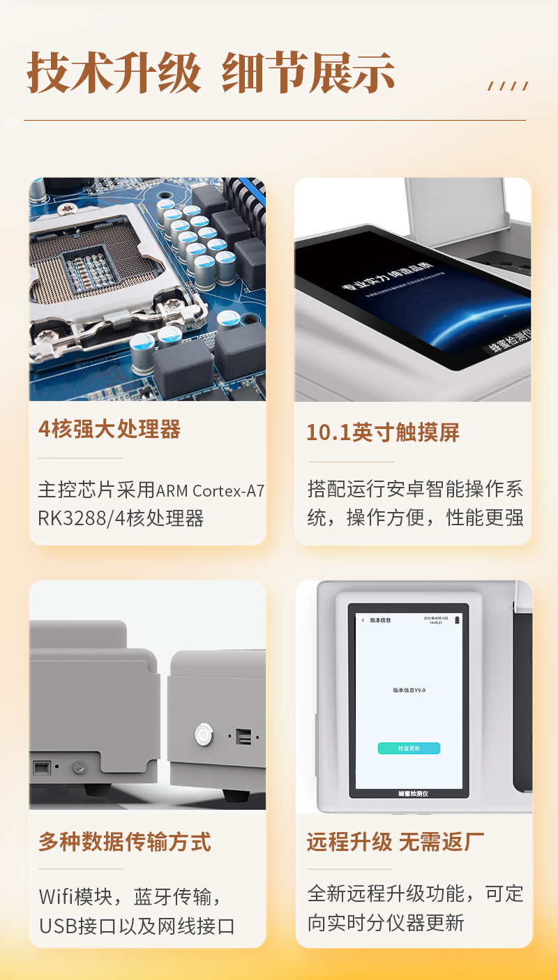 | 儀器采用臺(tái)式一體化系統(tǒng)檢測(cè)技術(shù),將分光光度模塊、數(shù)字化管理模塊、無(wú)線通訊模塊高度集成于一體,支持檢測(cè)200種食品安全檢測(cè)項(xiàng)目,同時(shí)預(yù)留升級(jí)檢測(cè)方法。 | 儀器檢測(cè)模塊標(biāo)準(zhǔn)化、智能化,檢測(cè)項(xiàng)目可隨意自由組合。檢測(cè)箱體內(nèi)置多個(gè)標(biāo)準(zhǔn)檢測(cè)單元,檢測(cè)模塊可以調(diào)整配置。 | 顯示屏幕:儀器采用10.1英寸豎向液晶觸摸屏顯,搭配運(yùn)行安卓智能操作系統(tǒng),主控芯片采用ARM Cortex-A7,RK3288/4核處理器,主頻1.88Ghz,操作方便,性能更強(qiáng)。 | 檢測(cè)通道:≥12通道;采用精密旋轉(zhuǎn)比色池設(shè)計(jì),使用同芯片同光源校準(zhǔn)精度,解決不同光源之間的誤差值,更加準(zhǔn)確**。(1-12通道間誤差0.1%,**號(hào):ZL202022821055.2) | 儀器光源:高精度進(jìn)口四波長(zhǎng)冷光源,每個(gè)通道均配置 410、520、590、630nm 波長(zhǎng)光源,標(biāo)配**的光路切換裝置,**光路切換功能可實(shí)現(xiàn)64波長(zhǎng),并且所有檢測(cè)項(xiàng)目可實(shí)現(xiàn)所有通道同時(shí)檢測(cè)。 | 設(shè)備可一鍵校準(zhǔn),自動(dòng)保存校準(zhǔn)數(shù)據(jù),自動(dòng)對(duì)比校驗(yàn),得到精準(zhǔn)光源,采用Android SP存儲(chǔ)數(shù)據(jù),光源數(shù)據(jù)永不丟失,方便每一次使用。 | 通訊接口:配備無(wú)線通信模塊、可選配4G(APN)通訊模塊和藍(lán)牙傳輸,同時(shí)具有雙USB接口以及RJ45網(wǎng)線接口,可以多方式實(shí)現(xiàn)數(shù)據(jù)保存及數(shù)據(jù)傳輸。 | 存儲(chǔ)方式:支持U盤(pán)存儲(chǔ),標(biāo)準(zhǔn)USB接口,免驅(qū)動(dòng)安裝。檢測(cè)結(jié)果存儲(chǔ)容量20萬(wàn)條以上,可生成Excel表格進(jìn)行拷貝,并具有登錄保護(hù)功能。 | 智能化操作系統(tǒng): | 1)操作系統(tǒng):儀器可在同一檢測(cè)界面自動(dòng)對(duì)應(yīng)相關(guān)檢測(cè)通道,一次性選擇1-12個(gè)樣品名稱(chēng),無(wú)需退出界面,節(jié)省操作時(shí)間。并可以對(duì)每個(gè)通道屬性和樣品信息單獨(dú)進(jìn)行編輯,例如送檢單位、人員,檢測(cè)人員等,打印時(shí)勾選打印顯示。 | 2)數(shù)據(jù)集成系統(tǒng):設(shè)備首頁(yè)自動(dòng)匯總分析檢測(cè)數(shù)據(jù),包含:周檢測(cè)數(shù)據(jù)、月檢測(cè)數(shù)據(jù),全部檢測(cè)總數(shù)量,均包含檢測(cè)總數(shù),合格數(shù),不合格數(shù),以及相關(guān)柱形分析圖,各項(xiàng)檢測(cè)數(shù)據(jù)一目了然,無(wú)需電腦查詢(xún),更加快捷直觀。 | 3)數(shù)據(jù)庫(kù)系統(tǒng):十幾項(xiàng)數(shù)據(jù)庫(kù)分類(lèi)管理儀器:包含項(xiàng)目類(lèi)型、項(xiàng)目數(shù)據(jù)、檢測(cè)數(shù)據(jù)、歷史記錄、國(guó)標(biāo)信息、曲線信息、采樣信息、檢測(cè)信息、受檢信息、復(fù)核信息、圖表信息、光源校準(zhǔn)信息、打印樣式信息、樣品庫(kù)信息等等,數(shù)據(jù)庫(kù)之間互相協(xié)調(diào)聯(lián)動(dòng)保證數(shù)據(jù)的真實(shí)完整性。同時(shí)產(chǎn)品數(shù)據(jù)庫(kù)以及歷史檢測(cè)記錄支持一鍵檢索功能。 | 4)限量規(guī)判系統(tǒng):具有限量查詢(xún)、添加物質(zhì)合規(guī)判定系統(tǒng)。檢測(cè)出結(jié)果后,系統(tǒng)自動(dòng)調(diào)用系統(tǒng)數(shù)據(jù)庫(kù)中相關(guān)國(guó)標(biāo)進(jìn)行比對(duì)判定,客觀顯示判定結(jié)果是否合格。 | 5)項(xiàng)目預(yù)設(shè)系統(tǒng):儀器具有任務(wù)預(yù)設(shè)模塊,一鍵提前預(yù)設(shè),給出方便快捷的新檢測(cè)方案,每一個(gè)任務(wù)分別可以設(shè)置不同的樣品、批次、編號(hào)、來(lái)源、備注、抽樣信息、檢測(cè)信息、受檢信息、復(fù)核信息等更多信息。樣品送檢時(shí)一鍵調(diào)取保存信息,并可多次調(diào)取,大大提高檢測(cè)效率。 | 6)數(shù)據(jù)監(jiān)管系統(tǒng):同步對(duì)接監(jiān)管平臺(tái),數(shù)據(jù)可局域網(wǎng)和互聯(lián)網(wǎng)數(shù)據(jù)上傳,檢測(cè)結(jié)果可選擇直接傳至食品安全監(jiān)管平臺(tái)。進(jìn)行區(qū)域食品安全監(jiān)管及大數(shù)據(jù)分析處理與數(shù)據(jù)統(tǒng)計(jì),檢測(cè)區(qū)域食品安全長(zhǎng)短期動(dòng)態(tài),達(dá)到食品安全問(wèn)題預(yù)估、預(yù)警。 | 7)打印系統(tǒng):內(nèi)置全新打印機(jī),新創(chuàng)自定義打印方式,可按需靈活勾選控制:產(chǎn)品合格證(國(guó)家農(nóng)業(yè)部標(biāo)準(zhǔn)要求),二維碼,抽樣信息、檢測(cè)信息,受檢信息、復(fù)核信息、抽樣日期、檢測(cè)日期等信息的打印。 | 供電模式:儀器交直流兩用,直流12V供電,可連接車(chē)載電源,可配6ah大容量充電鋰電池,電量可實(shí)時(shí)顯示,方便戶(hù)外流動(dòng)測(cè)試。 | 儀器加入遠(yuǎn)程升級(jí)功能,可定向分客戶(hù)分儀器更新,開(kāi)機(jī)后自動(dòng)更新,客戶(hù)無(wú)需任何操作,即可升級(jí)全新項(xiàng)目。做到了無(wú)需退換機(jī)器即可實(shí)現(xiàn)實(shí)時(shí)遠(yuǎn)程升級(jí)檢測(cè)儀器。 | 設(shè)備尺寸:(長(zhǎng)*寬*高)440*300*180mm | 儀器加入遠(yuǎn)程升級(jí)功能,可定向分客戶(hù)分儀器更新,開(kāi)機(jī)后自動(dòng)更新,客戶(hù)無(wú)需任何操作,即可升