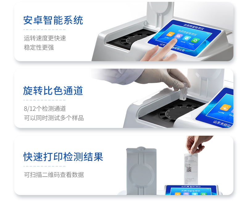 | 機(jī)器采用全新安卓智能系統(tǒng),主控芯片采用 ARM Cortex-A7,RK3288/4核處理器,主頻1.88Ghz,運(yùn)轉(zhuǎn)速度更快速,穩(wěn)定性更強(qiáng)。 | 創(chuàng)新檢測(cè)模式: *儀器采用精密旋轉(zhuǎn)比色池設(shè)計(jì),使用光源一致,可以解決各通道間由于光源誤差帶來的檢測(cè)結(jié)果誤差問題,檢測(cè)結(jié)果更加精準(zhǔn)。 *儀器具有自動(dòng)識(shí)別比色皿檢測(cè)功能,即:將樣品比色皿放入儀器后,點(diǎn)擊樣品檢測(cè),儀器自動(dòng)識(shí)別比色皿進(jìn)行通道檢測(cè)。  | 供電方式:交直流兩用,直流 12V 供電,可連接車載電源,可配 6ah 大容量充電鋰電池,方便戶外流動(dòng)測(cè)試。 | 顯示方式:7英寸液晶觸摸屏顯示,人性化中文操作界面,讀數(shù)直觀、簡(jiǎn)單。 | 檢測(cè)通道:12個(gè)檢測(cè)通道,可以同時(shí)測(cè)試多個(gè)樣品,循環(huán)檢測(cè),即放即檢,每個(gè)樣品由程序控制分別獨(dú)立工作,不會(huì)互相干擾。 | 高精光源系統(tǒng): ①①儀器光源采用進(jìn)口超高亮發(fā)光二極管,光源亮度可以自動(dòng)調(diào)節(jié)與校準(zhǔn) ②智能恒流穩(wěn)壓,光強(qiáng)自動(dòng)校準(zhǔn),長時(shí)間連續(xù)工作光源無溫漂現(xiàn)象。  | 智能操作分析系統(tǒng): ①儀器具有100多種蔬菜名稱菜單庫,分類管理,并可按需添加或刪除、編輯蔬菜名稱;可在同一檢測(cè)界面自動(dòng)對(duì)應(yīng)相關(guān)檢測(cè)通道一次性選擇1-24個(gè)樣品名稱,無需退出界面,節(jié)省操作時(shí)間。 ②內(nèi)置新國家限量標(biāo)準(zhǔn),與所測(cè)結(jié)果進(jìn)行現(xiàn)場(chǎng)比對(duì),并持續(xù)更新標(biāo)準(zhǔn)。  | 完善的配套硬件: ①采用串口5v打印機(jī),可選擇手動(dòng)打印或者自動(dòng)打印,三分鐘出打印結(jié)果,打印格式為檢測(cè)人姓名、吸光度差值、檢測(cè)時(shí)間、檢測(cè)機(jī)構(gòu)、樣品名稱及結(jié)果判定。 ②儀器具有無線上傳模塊,檢測(cè)結(jié)果可批量打印,批量上傳。  | 數(shù)據(jù)調(diào)用: ①儀器可存儲(chǔ)20萬條檢測(cè)結(jié)果, ②檢測(cè)結(jié)果為Excel表格,方便后期進(jìn)行數(shù)據(jù)分析與匯總報(bào)告 ③儀器采用USB2.0接口設(shè)計(jì),支持 U 盤存儲(chǔ),方便數(shù)據(jù)的存貯和移動(dòng),并可隨時(shí)與計(jì)算機(jī)直接相連,實(shí)現(xiàn)數(shù)據(jù)查詢、瀏覽、分析、統(tǒng)計(jì)、打印等。  | 后期產(chǎn)品固件可升級(jí)。 | 安全證書,放心保障:儀器具有中國計(jì)量科學(xué)研究院校準(zhǔn)證書,**認(rèn)證,使用放心。 |