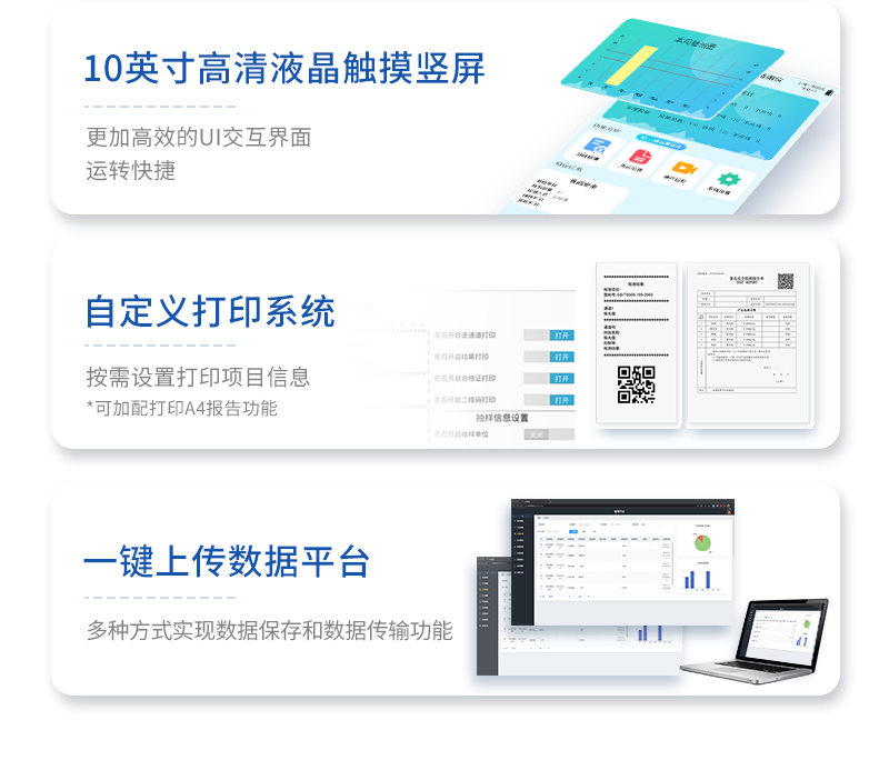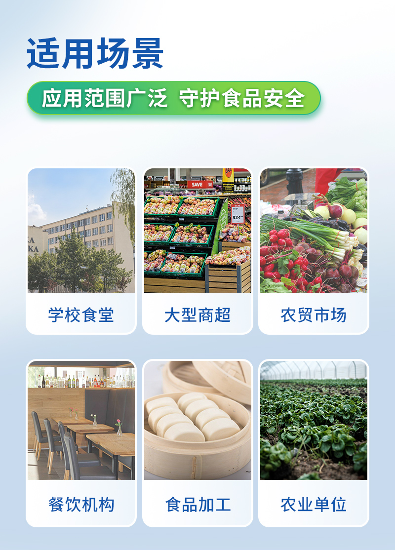 | 安卓智能操作系統(tǒng),采用更加**和人性化操作,儀器具有無(wú)線聯(lián)網(wǎng)上傳功能,快速上傳數(shù)據(jù),進(jìn)行數(shù)據(jù)統(tǒng)計(jì)和分析。 | 智能化程度高,儀器具有自檢功能:具有開(kāi)機(jī)自檢和調(diào)零功能,具有自動(dòng)檢測(cè)重復(fù)性功能;同時(shí),檢測(cè)完成可自動(dòng)打印檢測(cè)報(bào)告和二維碼。手機(jī)掃碼可顯示出詳細(xì)檢測(cè)信息。 | 儀器帶有監(jiān)管平臺(tái),數(shù)據(jù)可局域網(wǎng)和互聯(lián)網(wǎng)數(shù)據(jù)上傳,檢測(cè)結(jié)果直接傳至食品安全監(jiān)管平臺(tái)。進(jìn)行區(qū)域食品安全監(jiān)管及大數(shù)據(jù)分析處理與數(shù)據(jù)統(tǒng)計(jì),檢測(cè)區(qū)域食品安全長(zhǎng)短期動(dòng)態(tài),達(dá)到食品安全問(wèn)題預(yù)估、預(yù)警 。 | 樣品處理簡(jiǎn)單省力,整體操作快速、安全、便捷。 | 儀器具有自身保護(hù)功能,可設(shè)置用戶(hù)名及密碼,防止非工作人員操作等。 | 內(nèi)置強(qiáng)大的數(shù)據(jù)庫(kù),可在儀器上直接選擇樣品名稱(chēng)、檢測(cè)指標(biāo)、送檢單位等信息,也可在儀器上直接編輯錄入樣品名稱(chēng)、檢測(cè)指標(biāo)、送檢單位等信息并保存進(jìn)樣品數(shù)據(jù)庫(kù),方便后期操作調(diào)取使用。 | 儀器具有重新校準(zhǔn)、鎖定、恢復(fù)出廠設(shè)置功能。 |