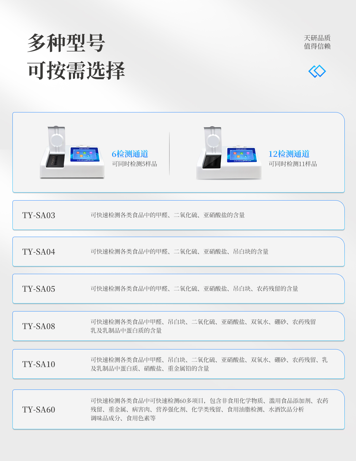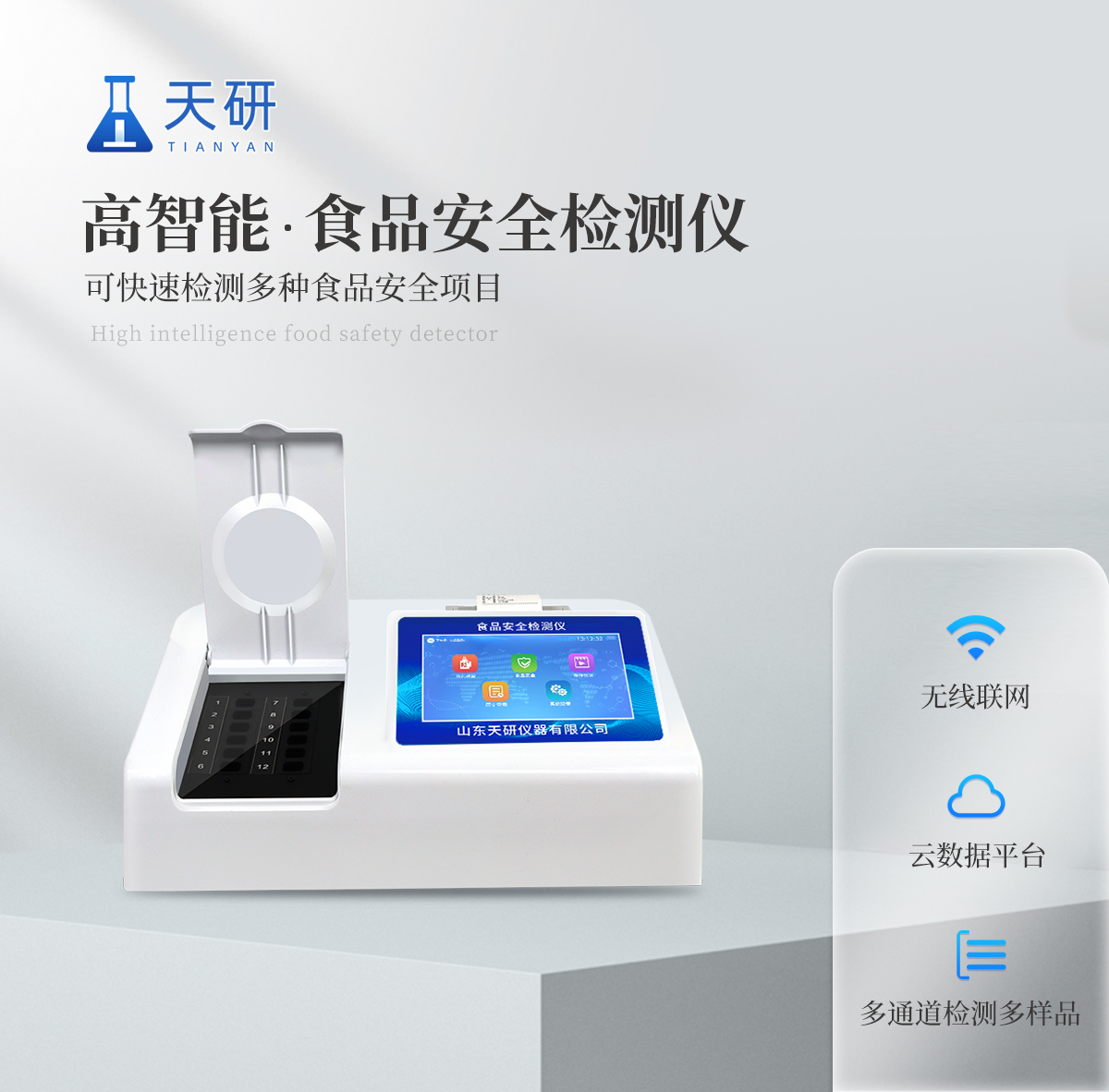 | 儀器采用臺(tái)式一體化系統(tǒng)檢測(cè)技術(shù),將分光光度模塊、新型農(nóng)殘檢測(cè)模塊、數(shù)字化管理模塊、無(wú)線通訊模塊高度集成于一體,支持檢測(cè)200種食品安全檢測(cè)項(xiàng)目,同時(shí)預(yù)留升級(jí)檢測(cè)方法。 | 儀器檢測(cè)模塊標(biāo)準(zhǔn)化、智能化,可隨意自由組合。檢測(cè)箱體內(nèi)置多個(gè)標(biāo)準(zhǔn)檢測(cè)單元,檢測(cè)模塊可以調(diào)整配置。 | 儀器采用全新安卓智能系統(tǒng),主控芯片采用 ARM Cortex-A7,RK3288/4核處理器,10.1寸高清液晶觸摸豎屏,更加**的UI交互界面,運(yùn)轉(zhuǎn)快捷;儀器配備無(wú)線通信模塊: 4G(APN)通訊模塊、Wifi模塊,藍(lán)牙傳輸,同時(shí)具有雙USB接口以及RJ45接口能以多種方式實(shí)現(xiàn)數(shù)據(jù)保存和數(shù)據(jù)傳輸功能。 | 創(chuàng)新檢測(cè)模式: | ★檢測(cè)通道:≥12通道;采用精密旋轉(zhuǎn)比色池設(shè)計(jì),使用同芯片同光源校準(zhǔn)精度,解決不同光源之間的誤差值。1-12通道間誤差0.1%。(**號(hào):ZL202022821055.2) | ★儀器具有自動(dòng)識(shí)別比色皿檢測(cè)功能,即:將樣品比色皿放入儀器后,點(diǎn)擊樣品檢測(cè),儀器自動(dòng)識(shí)別比色皿進(jìn)行通道檢測(cè)。 | 進(jìn)口高精光源: | 高精度進(jìn)口四波長(zhǎng)冷光源,通道配置 410、520、590、630nm 波長(zhǎng)光源,一個(gè)光源芯片驅(qū)動(dòng)一個(gè)光源,誤差極小,每臺(tái)設(shè)備單獨(dú)**校準(zhǔn)光源,**比對(duì),同時(shí)參照四種不同波段光源全方位覆蓋市面上99%的農(nóng)殘食品項(xiàng)目檢測(cè)。 | 智能化操作系統(tǒng): | 便捷操作系統(tǒng):設(shè)備檢測(cè)時(shí)可在同一檢測(cè)界面自動(dòng)對(duì)應(yīng)相關(guān)檢測(cè)通道一次性選擇1-12個(gè)樣品名稱,無(wú)須退出界面,節(jié)省操作時(shí)間。 | 數(shù)據(jù)集成系統(tǒng):設(shè)備首頁(yè)自動(dòng)統(tǒng)計(jì)檢測(cè)數(shù)據(jù)包含:周檢測(cè)數(shù)據(jù)、月檢測(cè)數(shù)據(jù),全部檢測(cè)總數(shù)量,均包含檢測(cè)總數(shù),合格數(shù),不合格數(shù),以及相關(guān)柱形分析圖,對(duì)各項(xiàng)檢測(cè)數(shù)據(jù)清晰掌握,無(wú)需電腦查詢,更加快捷直觀。 | 項(xiàng)目預(yù)設(shè)系統(tǒng):支持添加單個(gè)及多個(gè)相同或不相同的任務(wù)預(yù)設(shè),一鍵快速調(diào)取,每一個(gè)任務(wù)分別可以設(shè)置不同的樣品、批次、編號(hào)、來源、備注、抽樣信息、檢測(cè)信息、受檢信息、復(fù)核信息等更多信息。無(wú)縫鏈接平臺(tái)和APP實(shí)時(shí)查看下發(fā)任務(wù)。 | 數(shù)據(jù)監(jiān)管系統(tǒng):同步對(duì)接監(jiān)管平臺(tái),數(shù)據(jù)可局域網(wǎng)和互聯(lián)網(wǎng)數(shù)據(jù)上傳,檢測(cè)結(jié)果可選擇直接傳至食品安全監(jiān)管平臺(tái)。集成OSS輸出存儲(chǔ)服務(wù)、區(qū)分設(shè)備定向管理應(yīng)用,進(jìn)行區(qū)域食品安全監(jiān)管及大數(shù)據(jù)分析處理與數(shù)據(jù)統(tǒng)計(jì),檢測(cè)區(qū)域食品安全長(zhǎng)短期動(dòng)態(tài),達(dá)到食品安全問題預(yù)估、預(yù)警。 | 自定義打印系統(tǒng):內(nèi)置全新打印系統(tǒng),新創(chuàng)自定義打印方式,可按需靈活設(shè)置開啟或關(guān)閉:產(chǎn)品合格證(國(guó)家農(nóng)業(yè)部標(biāo)準(zhǔn)要求),二維碼,抽樣信息、檢測(cè)信息,受檢信息、復(fù)核信息、抽樣日期、檢測(cè)日期等信息的打印。 | 系統(tǒng)遠(yuǎn)程更新功能:可定向分客戶分儀器更新系統(tǒng),按照不同客戶后期實(shí)際需求添加項(xiàng)目,無(wú)需機(jī)器返廠,即可遠(yuǎn)程實(shí)時(shí)升級(jí)全新系統(tǒng),節(jié)省時(shí)間成本及避免運(yùn)輸造成設(shè)備損壞。 | 儀器主機(jī)采用一體化防水、抗壓、防撞擊、防腐蝕箱體設(shè)計(jì),同時(shí)配備交直流供電,可連接車載電源,可選配大容量充電鋰電池,滿足現(xiàn)場(chǎng)野外檢測(cè)需求。 | 安全證書,放心保障:儀器具有中國(guó)計(jì)量科學(xué)研究院校準(zhǔn)證書,**認(rèn)證。 |