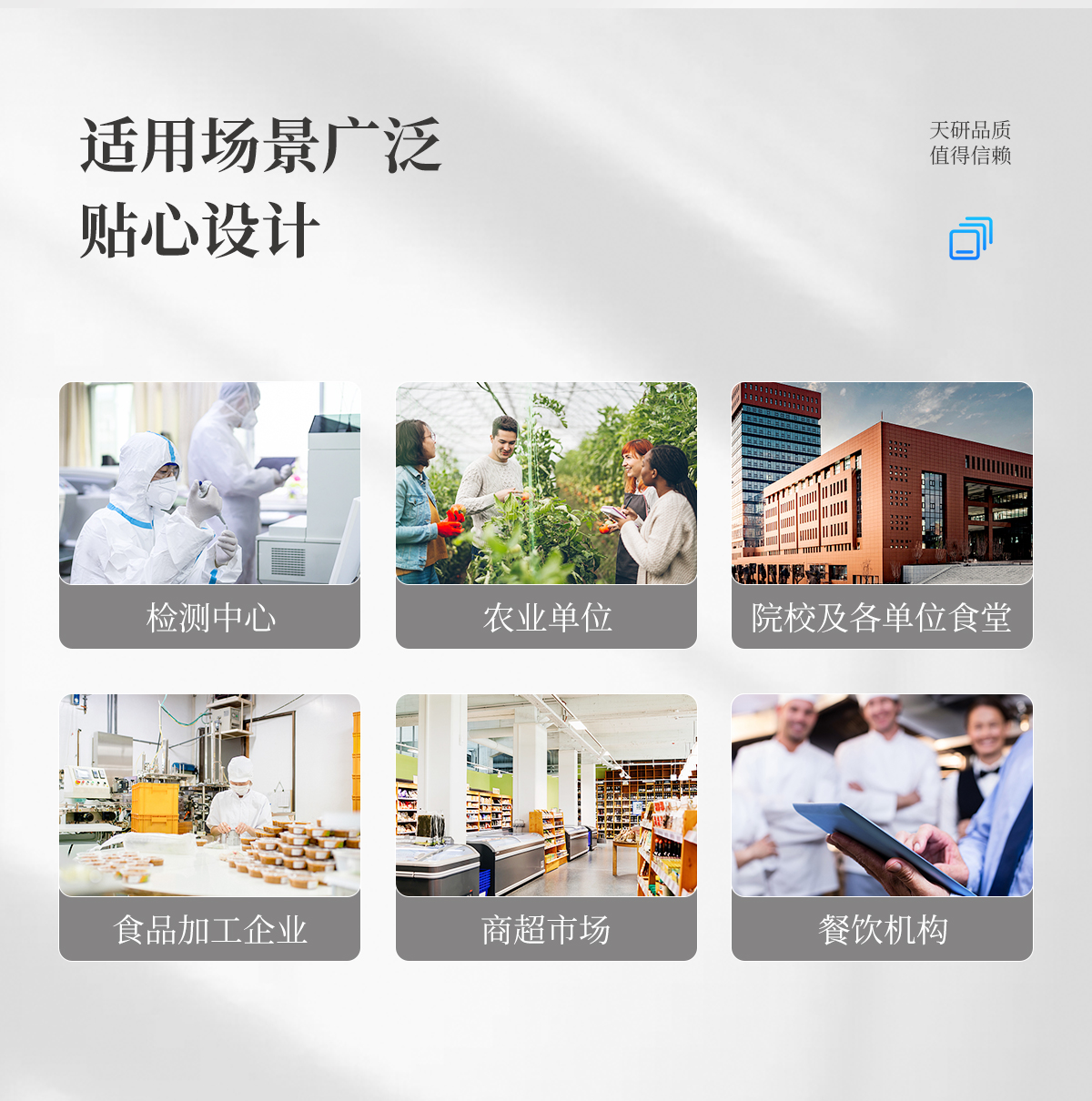 該多功能食品安全檢測(cè)儀為集成化食品安全快速檢測(cè)分析設(shè)備,廣泛應(yīng)用于市場(chǎng)監(jiān)管局、食品肉產(chǎn)品深加工企業(yè)、學(xué)校食堂、衛(wèi)生部門、畜牧部門、屠宰場(chǎng)、檢驗(yàn)檢疫部門等單位使用。