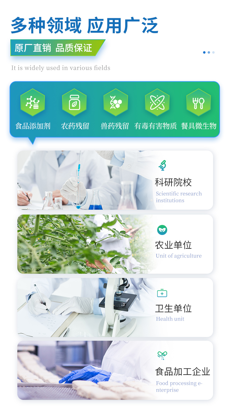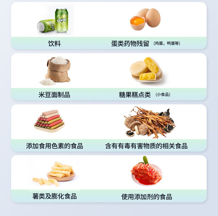 | 功能構(gòu)成:主要包括分光光度模塊、新型農(nóng)殘檢測模塊、膠體金檢測模塊、熒光檢測模塊、數(shù)字化管理模塊等,所有模塊集成一體,可快速檢測200多種食品安全項目,如獸藥殘留、農(nóng)藥殘留、非法添加劑、細菌數(shù)值等指標。 | 檢測樣品種類:餐具及廚房用品、瓜果蔬菜及其制品、水產(chǎn)品及其制品、畜禽產(chǎn)品及其制品、嬰幼兒乳品及奶粉制品、蜂蜜、糧油及其制品、調(diào)味品(食醋、醬油、味精、鹽等)、酒類茶葉及其制品、食用菌、飲料、蛋類藥物殘留(雞蛋,鴨蛋等)、米豆面制品、糖果糕點類(小食品)、薯類及膨化食品、瓶(桶)裝飲用水、添加食用色素的食品、使用添加劑的食品、含有有毒有害物質(zhì)的相關(guān)食品。 | 顯示屏幕:儀器采用15.6英寸液晶觸摸屏顯,搭配運行安卓智能操作系統(tǒng),主控芯片采用ARM Cortex-A7,RK3288/4核處理器,主頻1.88Ghz,操作方便,性能更強。 | 供電模式:儀器交直流兩用,直流12V供電,可連接車載電源,配18ah大容量充電鋰電池,電量可實時顯示,無外部電源條件下可持續(xù)工作至少 4 小時。 | 檢測通道:≥24通道;采用精密旋轉(zhuǎn)比色池設(shè)計,使用同芯片同光源校準精度,解決不同光源之間的誤差值,更加準確**,采用高精度進口四波長冷光源,每個通道均配置 410、520、590、630nm 波長光源,標配**的光路切換裝置,**光路切換功能可實現(xiàn)64波長,并且所有檢測項目可實現(xiàn)所有通道同時檢測. | 通訊接口:配備無線通信模塊、4G(APN)通訊模塊、藍牙傳輸,同時具有雙USB接口以及RJ45網(wǎng)線接口,可以多方式實現(xiàn)數(shù)據(jù)保存及數(shù)據(jù)傳輸。 | 存儲方式:支持U盤存儲,兩個標準USB接口,免驅(qū)動安裝。檢測結(jié)果存儲容量20萬條以上,可生成Excel表格進行拷貝,并具有登錄保護功能。 | 操作系統(tǒng):儀器可在同一檢測界面自動對應(yīng)相關(guān)檢測通道,一次性選擇不少于11個樣品名稱,無需退出界面,節(jié)省操作時間。并可以對每個通道屬性和樣品信息單獨進行編輯,例如送檢單位、人員,檢測人員等,打印時勾選打印顯示。 | 數(shù)據(jù)集成系統(tǒng):設(shè)備首頁自動匯總分析檢測數(shù)據(jù),包含:周檢測數(shù)據(jù)、月檢測數(shù)據(jù),全部檢測總數(shù)量,包含檢測總數(shù),合格數(shù),不合格數(shù),以及相關(guān)柱形分析圖,各項檢測數(shù)據(jù)一目了然,無需電腦查詢,更加快捷直觀。 | 數(shù)據(jù)庫系統(tǒng):十幾項數(shù)據(jù)庫分類管理儀器:包含項目類型、項目數(shù)據(jù)、檢測數(shù)據(jù)、歷史記錄、國標信息、曲線信息、采樣信息、檢測信息、受檢信息、復(fù)核信息、圖表信息、光源校準信息、打印樣式信息、樣品庫信息等等,數(shù)據(jù)庫之間互相協(xié)調(diào)聯(lián)動保證數(shù)據(jù)的真實完整性。同時產(chǎn)品數(shù)據(jù)庫以及歷史檢測記錄支持一鍵檢索功能。 | 限量規(guī)判系統(tǒng):具有限量查詢、添加物質(zhì)合規(guī)判定系統(tǒng)。檢測出結(jié)果后,系統(tǒng)自動調(diào)用系統(tǒng)數(shù)據(jù)庫中相關(guān)國標進行比對判定,客觀顯示判定結(jié)果是否合格。 | 項目預(yù)設(shè)系統(tǒng):儀器具有任務(wù)預(yù)設(shè)模塊,一鍵提前預(yù)設(shè),給出方便快捷的新檢測方案,每一個任務(wù)分別可以設(shè)置不同的樣品、批次、編號、來源、備注、抽樣信息、檢測信息、受檢信息、復(fù)核信息等更多信息。樣品送檢時一鍵調(diào)取保存信息,并可多次調(diào)取,適用于大批量檢測業(yè)務(wù),可以大大提高檢測效率。 | 數(shù)據(jù)監(jiān)管系統(tǒng):同步對接監(jiān)管平臺,數(shù)據(jù)可局域網(wǎng)和互聯(lián)網(wǎng)數(shù)據(jù)上傳,檢測結(jié)果可直接傳至食品安全監(jiān)管平臺。進行區(qū)域食品安全監(jiān)管及大數(shù)據(jù)分析處理與數(shù)據(jù)統(tǒng)計,監(jiān)測區(qū)域食品安全長短期動態(tài)及問題預(yù)估、預(yù)警 | 全新打印系統(tǒng):內(nèi)置全新打印機,新創(chuàng)自定義打印方式,可按需靈活勾選控制:產(chǎn)品合格證(國家農(nóng)業(yè)部標準要求),二維碼,抽樣信息、檢測信息,受檢信息、復(fù)核信息、抽樣日期、檢測日期等信息的打印。 | A4紙版本報告打印功能:設(shè)備擁有兩種結(jié)果展示方式,可以自動生成A4打印模板和小票打印模板兩種樣式,可通過WiFi及網(wǎng)線等方式連接外置打印機可進行打印。 | 膠體金檢測模塊:采用單通道CMOS成像處理技術(shù)及膠體金免疫層析技術(shù),可讀取膠體金卡數(shù)據(jù),自動采集、處理分析,將檢測結(jié)果顯示,并可根據(jù)參考限值自動判斷檢測結(jié)果,可檢測常見的獸藥殘留、生物毒素、抗生素、違禁添加物等。 | 可即時檢測單聯(lián)卡及三聯(lián)卡; | 檢測通道:2個通道; | 檢測方式:消線法和比色法; | 顯示模式:陰性或陽性; | 曲線形式:插入式掃描方式,顯示金標卡圖像,實時生成、識別CT曲線圖,無需手動調(diào)整。兼容市場上其他金標卡,使用耗材不受限制。 | 熒光檢測模塊:快速檢測水質(zhì)中微生物、固體物細菌含量。利用“熒光素酶—熒光素體系”快速檢測三磷酸腺苷(ATP)。以ATP含量表明樣品中微生物與其他生物殘余得多少,用于判斷衛(wèi)生狀況。 適用于食品、餐具、手、液體等