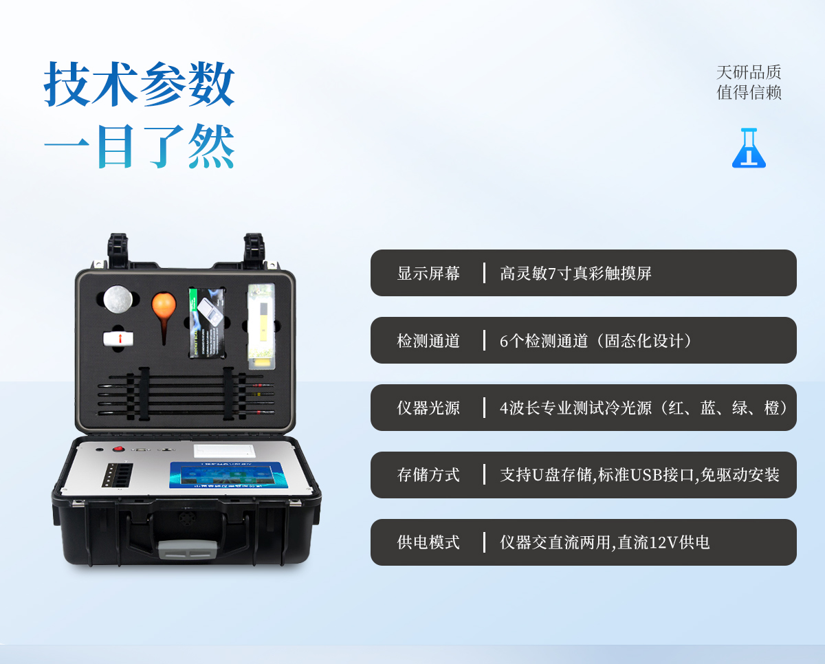 | 1、本儀器集各功能于一身,無需用戶自配附件,可靈活流動檢測。 | 2、安卓智能操作系統(tǒng),主控芯片采用ARM Cortex-A7,RK3288/4核處理器,主頻1.88Ghz,運轉(zhuǎn)速度更快速,穩(wěn)定性更強。 | 3、6個檢測通道(固態(tài)化設(shè)計),一次性可快速檢測6個樣品,極大提升檢測效率,降低檢測成本。 | 4、檢測過程中內(nèi)置校準(zhǔn)功能,智能恒流穩(wěn)壓,光強自動校準(zhǔn),確保檢測準(zhǔn)確度。 | 5、內(nèi)置作物專家施肥系統(tǒng),可對百余種全國農(nóng)業(yè)經(jīng)濟作物、果樹等的目標(biāo)產(chǎn)量計算推薦施肥量,依據(jù)施肥配方科學(xué)指導(dǎo)農(nóng)業(yè)生產(chǎn)。測土配方施肥結(jié)果可打印,打印內(nèi)容包含:作物種類、肥料種類、目標(biāo)產(chǎn)量、需求總量、建議施肥方案。 | 6、儀器標(biāo)配wifi無線上傳、4G聯(lián)網(wǎng)傳輸、GPRS無線遠傳功能,快速上傳數(shù)據(jù)。 | 7、儀器內(nèi)置大容量內(nèi)存,支持查看全部歷史檢測記錄,以及傳輸所有檢測數(shù)據(jù)。 | 8、配有智慧云農(nóng)業(yè)平臺,儀器連入無線網(wǎng)絡(luò)后,可將檢測數(shù)據(jù)可選擇性或批量無線上傳,方便用戶進行長期數(shù)據(jù)管理和可視化分析 | 9、儀器同時具有USB接口、以太網(wǎng)接口,并可隨時用U盤拷貝出數(shù)據(jù)。 | 10、可用手機隨時登錄云平臺在線移動查看歷史數(shù)據(jù) | 11、內(nèi)置植物營養(yǎng)診斷標(biāo)準(zhǔn)圖譜,根據(jù)各農(nóng)作物營養(yǎng)缺失的圖片,進行葉面對比,診斷豐缺。 | 12、4波長專業(yè)測試?yán)涔庠矗t、藍、綠、橙),光源波長穩(wěn)定,長時間連續(xù)工作光源無溫漂現(xiàn)象,壽命長達10萬小時級別,重現(xiàn)性好,準(zhǔn)確度高。 | 13、比色池部分采用標(biāo)準(zhǔn)1cm比色皿,無機械位移及磨損,光路測試定位**,有效屏蔽外光干擾,保證檢測結(jié)果優(yōu)于國標(biāo)要求。 | 14、儀器系統(tǒng)內(nèi)帶有樣品前處理操作視頻,各種樣品檢測方法點擊視頻模塊即可觀看,檢測人員無需自學(xué)說明書,指導(dǎo)教學(xué)方便快速,方便新手快速操作。 | 15、內(nèi)置新一代高速熱敏打印機(無需色帶),打印內(nèi)容包含:檢測單位、檢測人員、檢測項目、通道號、吸光度、養(yǎng)分含量(mg/kg)、檢測時間、以及二維碼等信息 | 16、高靈敏7寸真彩觸摸屏,采用更加**和人性化操作,高清晰高交互顯示,大程度降低傳統(tǒng)儀器的繁瑣操作和失誤。 | 17、內(nèi)置時鐘功能,方便操作時間記錄,長期歷史追溯。 | 18、可設(shè)置多賬戶賬號密碼登錄,**UI交互界面,不同的用戶可自由添加編輯檢測信息,保存后可長期使用。 | 19、GPS功能:可在野外作業(yè)時記錄經(jīng)緯度地點,滿足特殊用戶需求。 | 20、內(nèi)置低電壓提示功能,可在檢測時明確電量,避免測試數(shù)據(jù)偏移,同時具有斷電保護功能,斷電自動保存數(shù)據(jù),防止數(shù)據(jù)丟失。 | 21、交直流兩用供電方式,內(nèi)置大容量充電鋰電池,滿電狀態(tài)下可連續(xù)工作10余小時,同時可外接車載電源蓄電。 | 22、儀器具有中英文切換功能,可滿足出口要求。 | 23、高強度PVC工程塑料手提箱設(shè)計,堅固耐用,便于攜帶。 |