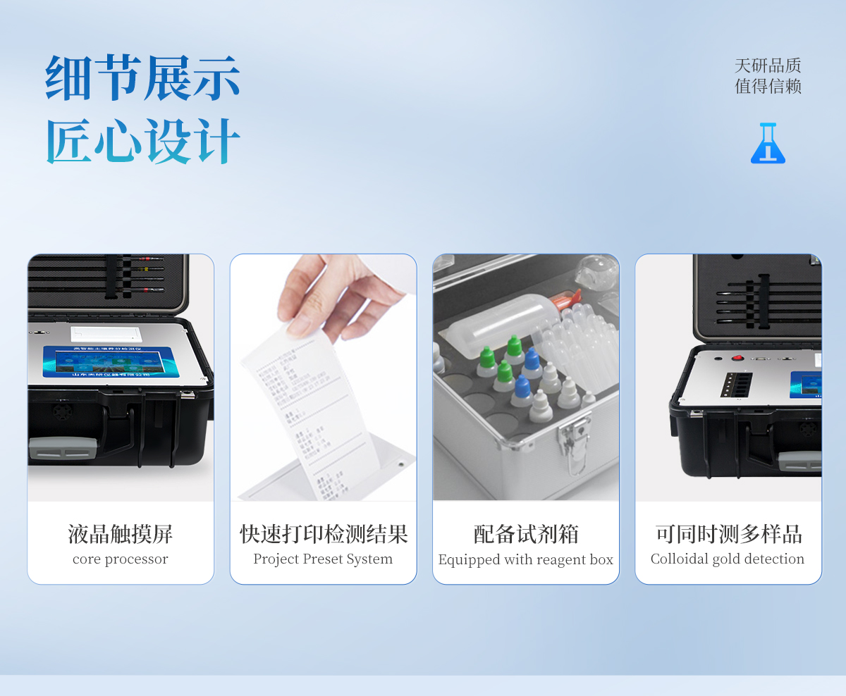 | 配套齊全:該儀器集藥、器、儀為一體,攜帶方便,相當(dāng)于一個小型移動實驗室,無需用戶自配附件,亦可靈活野外流動測試。適于農(nóng)業(yè)服務(wù)部門或農(nóng)資經(jīng)銷商、合作社、肥料廠商、大種植戶測土施肥。 | 檢測功能全:測試項目國內(nèi)外全面,除標(biāo)配試劑外,其他各類藥劑均可加配選購。 | 操作簡便、速度快捷,配套整套附件及成品藥劑開瓶即用,無須配置。 |