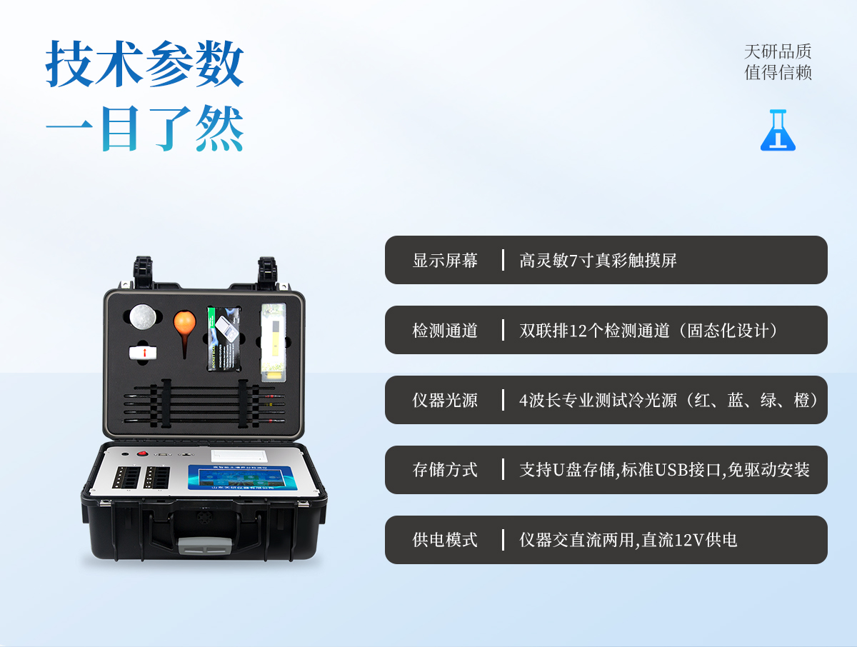 | 1、本儀器集各功能于一身,無需用戶自配附件,可靈活流動檢測。 | 2、安卓(Android)智能操作系統(tǒng),主控芯片采用ARM Cortex-A7,RK3288/4核處理器,主頻1.88Ghz,運轉(zhuǎn)速度更快速,穩(wěn)定性更強。 | 3、雙聯(lián)排12個檢測通道(固態(tài)化設(shè)計),一次性可快速檢測12個樣品,極大提升檢測效率,降低檢測成本。 | 4、檢測過程中內(nèi)置校準功能,智能恒流穩(wěn)壓,光強自動校準,確保檢測準確度。 | 5、內(nèi)置作物專家施肥系統(tǒng),可對百余種全國農(nóng)業(yè)經(jīng)濟作物、果樹等的目標產(chǎn)量計算推薦施肥量,依據(jù)施肥配方科學指導農(nóng)業(yè)生產(chǎn)。測土配方施肥結(jié)果可打印,打印內(nèi)容包含:作物種類、肥料種類、目標產(chǎn)量、需求總量、建議施肥方案。 | 6、儀器標配wifi無線上傳、4G聯(lián)網(wǎng)傳輸、GPRS無線遠傳功能,快速上傳數(shù)據(jù)。 | 7、儀器內(nèi)置大容量內(nèi)存,支持查看全部歷史檢測記錄,以及傳輸所有檢測數(shù)據(jù)。 | 8、配有智慧云農(nóng)業(yè)平臺,儀器連入無線網(wǎng)絡后,可將檢測數(shù)據(jù)可選擇性或批量無線上傳,方便用戶進行長期數(shù)據(jù)管理和可視化分析。 | 9、儀器配同時具有USB接口、以太網(wǎng)接口,并可隨時用U盤拷貝出數(shù)據(jù)。 | 10、可用手機隨時登錄云平臺在線移動查看歷史數(shù)據(jù) | 11、內(nèi)置植物營養(yǎng)診斷標準圖譜,根據(jù)各農(nóng)作物營養(yǎng)缺失的圖片,進行葉面對比,診斷豐缺。 | 12、4波長專業(yè)測試冷光源(紅、藍、綠、橙),光源波長穩(wěn)定,長時間連續(xù)工作光源無溫漂現(xiàn)象,壽命長達10萬小時級別,重現(xiàn)性好,準確度高。 | 13、比色池部分采用標準1cm比色皿,無機械位移及磨損,光路測試定位**,有效屏蔽外光干擾,保證檢測結(jié)果優(yōu)于國標要求。 | 14、儀器系統(tǒng)內(nèi)帶有樣品前處理操作視頻,各種樣品檢測方法點擊視頻模塊即可觀看,檢測人員無需自學說明書,指導教學方便快速,方便新手快速操作。 | 15、內(nèi)置新一代高速熱敏打印機(無需色帶),打印內(nèi)容包含:檢測單位、檢測人員、檢測項目、通道號、吸光度、養(yǎng)分含量(mg/kg)、檢測時間、以及二維碼等信息 | 16、高靈敏7寸真彩觸摸屏,采用更加**和人性化操作,高清晰高交互顯示,大程度降低傳統(tǒng)儀器的繁瑣操作和失誤。 | 17、內(nèi)置時鐘功能,方便操作時間記錄,長期歷史追溯。 | 18、可設(shè)置多賬戶賬號密碼登錄,**UI交互界面,不同的用戶可自由添加編輯檢測信息,保存后可長期使用。 | 19、GPS功能:可在野外作業(yè)時記錄經(jīng)緯度地點,滿足特殊用戶需求。 | 20、內(nèi)置低電壓提示功能,可在檢測時明確電量,避免測試數(shù)據(jù)偏移,同時具有斷電保護功能,斷電自動保存數(shù)據(jù),防止數(shù)據(jù)丟失。 | 21、交直流兩用供電方式,內(nèi)置大容量充電鋰電池,滿電狀態(tài)下可連續(xù)工作10余小時,同時可外接車載電源蓄電。 | 22、儀器具有中英文切換功能,可滿足出口要求。 | 23、高強度PVC工程塑料手提箱設(shè)計,堅固耐用,便于攜帶。 |