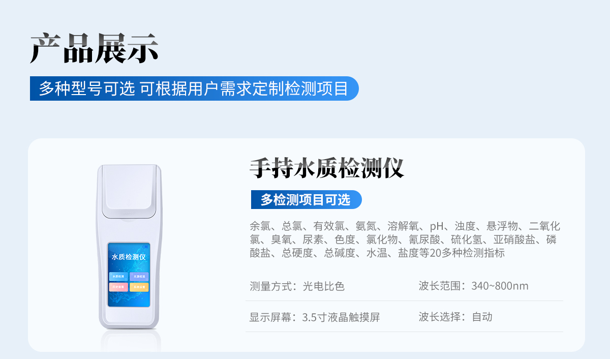 | 安卓智能系統(tǒng),操作更佳簡(jiǎn)便快捷; | 配置監(jiān)管平臺(tái),檢測(cè)結(jié)果可直接無線傳至平臺(tái),進(jìn)行水質(zhì)長(zhǎng)短期分析,輔助管理。 | 內(nèi)置操作流程、操作簡(jiǎn)單、無需培訓(xùn)、直接上手; | 檢測(cè)速度快,現(xiàn)場(chǎng)讀取數(shù)據(jù) | 便攜式體積小,重量輕,方便戶外檢測(cè) | 外形小巧美觀,工作穩(wěn)定免維護(hù),具有較好的性價(jià)比 | 采用進(jìn)口冷光源,光學(xué)性能穩(wěn)定,壽命長(zhǎng)達(dá)10萬小時(shí) | 交直流兩用,內(nèi)置充電鋰電池,環(huán)保耐用可支持連續(xù)室內(nèi)外工作。 |