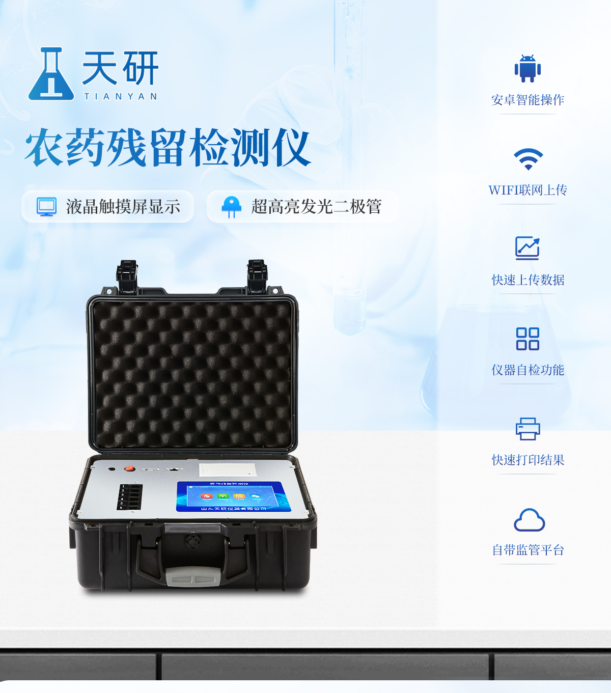 | 隨著人民生活水平的不斷提升,市場對茶葉的把控愈加嚴(yán)格。針對現(xiàn)狀,我司專門研發(fā)生產(chǎn)--茶葉專用的農(nóng)藥殘留速測儀;定位茶農(nóng)、茶商、茶葉企業(yè)使用。				 此外還可用于果蔬茶生產(chǎn)基地和農(nóng)貿(mào)批發(fā)銷售市場現(xiàn)場檢測,餐館、學(xué)校、食堂、家庭果蔬加工前的安全速測等。  | 檢測通道: 5個(gè)檢測通道,可以同時(shí)測試多個(gè)樣品,每個(gè)樣品由程序控制分別獨(dú)立工作,不會(huì)互相干擾。  | 顯示方式:≥5英寸液晶觸摸屏顯示,人性化中文操作界面,讀數(shù)直觀、簡單。 | 配備嵌入式高速熱敏打印機(jī),可選擇手動(dòng)打印或者自動(dòng)打印,三分鐘出打印結(jié)果。 | 光源采用進(jìn)口超高亮發(fā)光二極管,具有低功耗、穩(wěn)定性強(qiáng)、高靈敏度,高檢測精度,高重復(fù)性精度,光源可控、響應(yīng)速度快等優(yōu)點(diǎn)。 | 采用標(biāo)準(zhǔn)USB接口設(shè)計(jì),免驅(qū)動(dòng)安裝,方便數(shù)據(jù)的存貯和移動(dòng),并可隨時(shí)與計(jì)算機(jī)直接相連,并且可用計(jì)算機(jī)控制儀器。實(shí)現(xiàn)數(shù)據(jù)查詢、瀏覽、分析、統(tǒng)計(jì)、打印等。 | 智能化程度高,儀器具有自檢功能:具有開機(jī)自檢和調(diào)零功能,具有自動(dòng)檢測重復(fù)性功能 | 內(nèi)置強(qiáng)大的數(shù)據(jù)庫,可在儀器上直接選擇樣品名稱、檢測指標(biāo)、送檢單位等信息,也可在儀器上直接編輯錄入樣品名稱、檢測指標(biāo)、送檢單位等信息并保存進(jìn)樣品數(shù)據(jù)庫。 | 支持Wifi網(wǎng)絡(luò),數(shù)據(jù)可局域網(wǎng)和互聯(lián)網(wǎng)數(shù)據(jù)上傳,檢測結(jié)果直接傳至食品安全監(jiān)管平臺(tái)。進(jìn)行區(qū)域食品安全監(jiān)管及大數(shù)據(jù)分析處理,檢測區(qū)域食品安全長短期動(dòng)態(tài),達(dá)到食品安全問題預(yù)估、預(yù)警 |