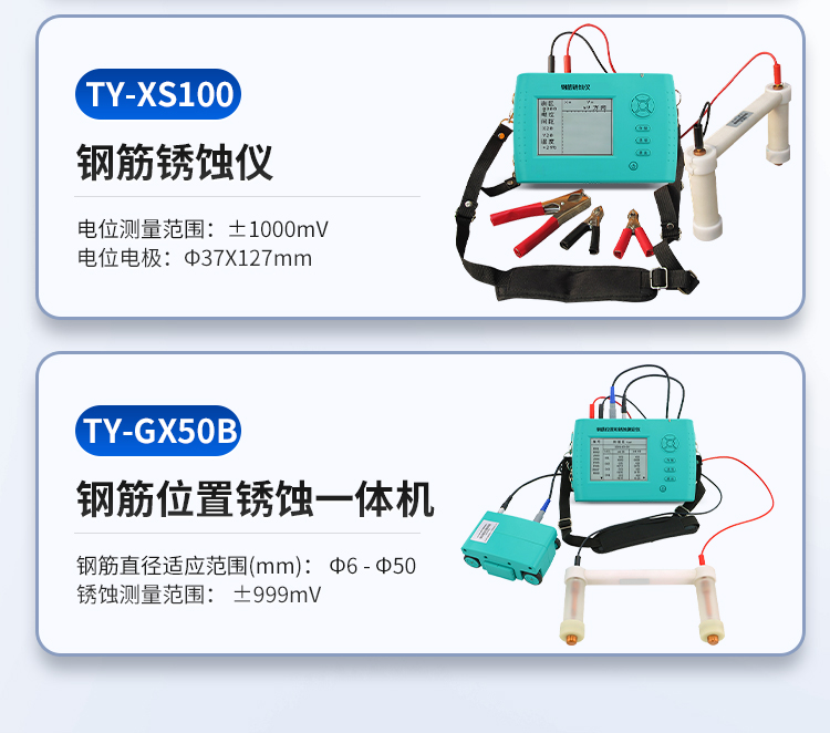 | TY-XS100鋼筋銹蝕檢測儀,采用極化電極原理,通過銅/硫酸銅參比電極來測量混凝土表面電位,根據(jù)鋼筋銹蝕生產(chǎn)的電位大小或形成的電位梯度大小判斷鋼筋是否銹蝕或銹蝕程度。 | 測量混凝土表面電位從而達到無損檢測混凝土中鋼筋的銹蝕程度。 | 儲存每個測區(qū)對應(yīng)位置的電位值,并用圖形顯示。并將數(shù)據(jù)傳輸?shù)缴衔粰C軟件中,并對其進行操作。 |