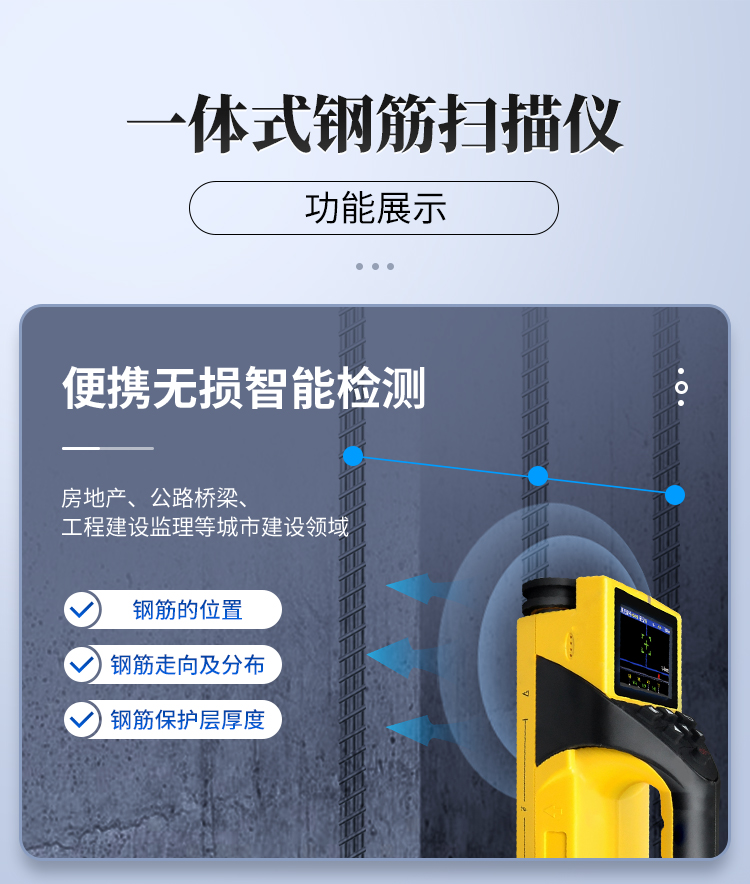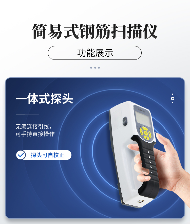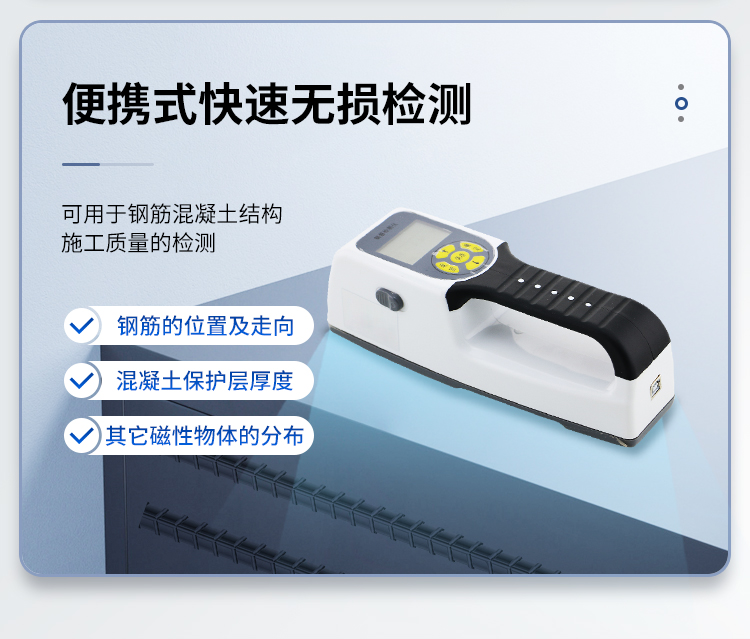 產(chǎn)品簡介:該機為內(nèi)置一體式探頭,無須連接引線,可手持直接操作是一種便攜式無損鋼筋保護層厚度檢測儀器??捎糜阡摻罨炷两Y(jié)構(gòu)施工質(zhì)量的檢測。能夠在混凝土表面確定鋼筋的位置、布筋情況,測量混凝土保護層厚度,此外也可對混凝土結(jié)構(gòu)中的磁性體及導(dǎo)電體的位置進行檢測,如墻體內(nèi)的電纜、水暖管道等,施工前的探測可以有效