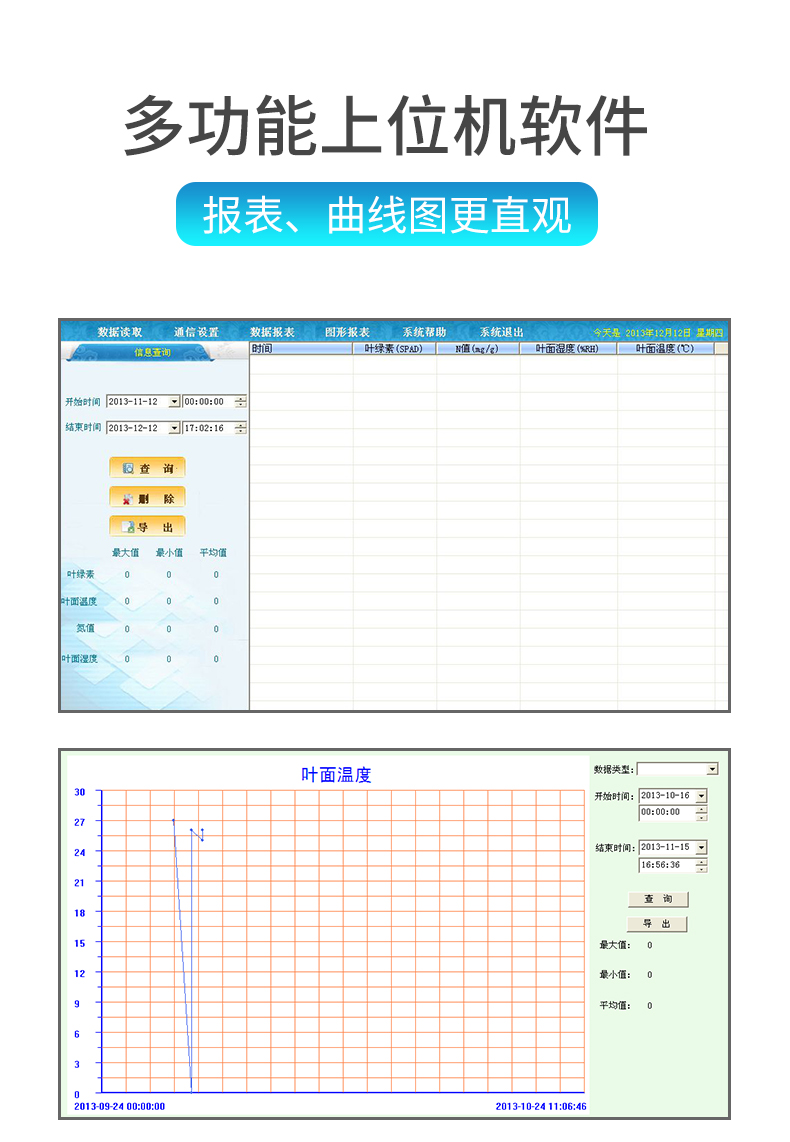 | 葉綠素測(cè)定儀TY-YB可同時(shí)測(cè)量葉綠素、葉面溫度兩個(gè)參數(shù),帶上位機(jī)軟件功能,數(shù)據(jù)可導(dǎo)出。 | 快速無(wú)損植物活體檢測(cè),不影響植物成長(zhǎng)。 | 一次操作可同時(shí)測(cè)定所有參數(shù),實(shí)時(shí)顯示,且可同時(shí)儲(chǔ)存 | 歷史數(shù)據(jù)查看,即可順序查看,也可跳轉(zhuǎn)查看。 | 測(cè)量數(shù)據(jù)可連接計(jì)算機(jī)將測(cè)量數(shù)據(jù)導(dǎo)出,便于管理和分析。 | 歷史數(shù)據(jù)查看,即可順序查看,也可跳轉(zhuǎn)查看。 | 意外斷電后已保存在主機(jī)里的數(shù)據(jù)不丟失。 | 對(duì)于歷史數(shù)據(jù)即可逐條刪除,也可以一鍵式全部刪除。 | 使用鋰電池供電,帶背光功能。 | 中英文一鍵式切換。 | 上位機(jī)軟件功能(YT-YB型): | 每種參數(shù)的報(bào)表、曲線圖均可選擇時(shí)段查詢查看。 | 顯示每種參數(shù)過(guò)程曲線趨勢(shì),**值、*小值、平均值顯示查看,放大、縮小功能。 | 可將存儲(chǔ)記錄的數(shù)據(jù)以EXCEL格式備份保存,方便以后調(diào)用。 | 可將存儲(chǔ)記錄的數(shù)據(jù)曲線圖以BMP圖片格式備份保存,方便以后調(diào)用。 |
