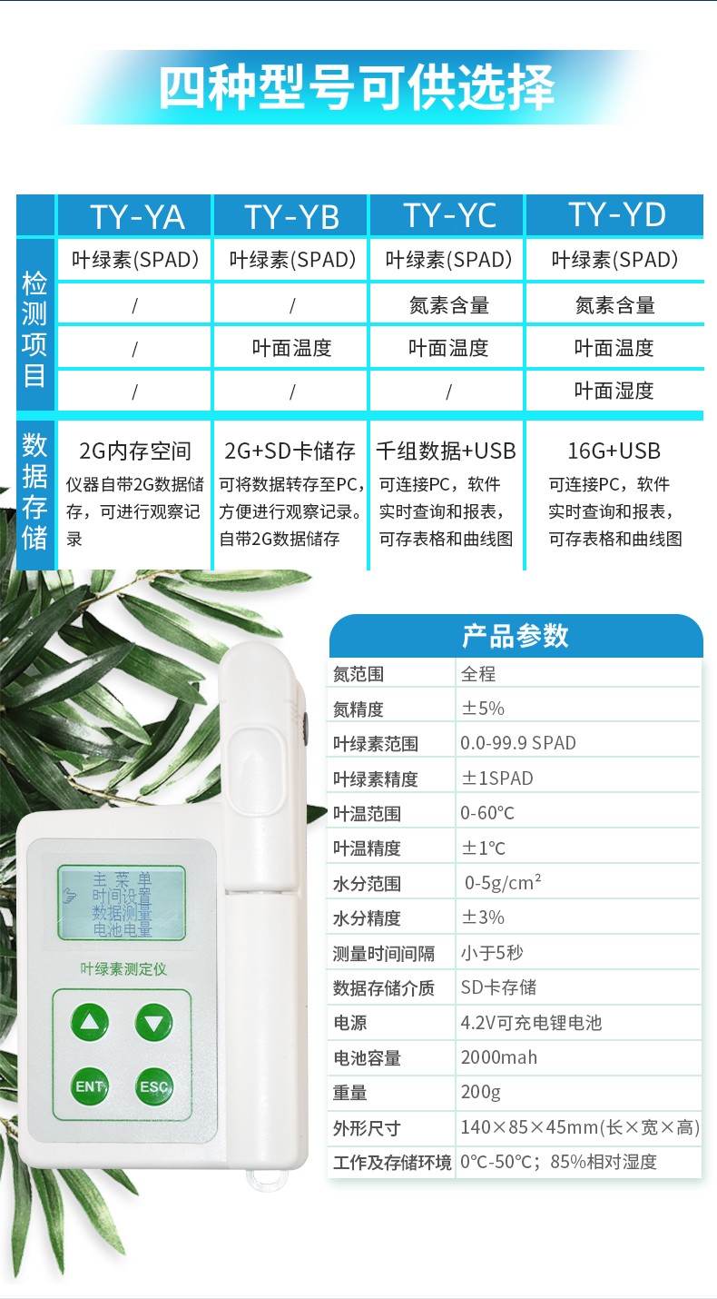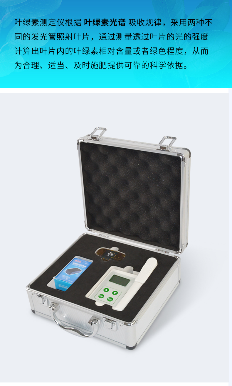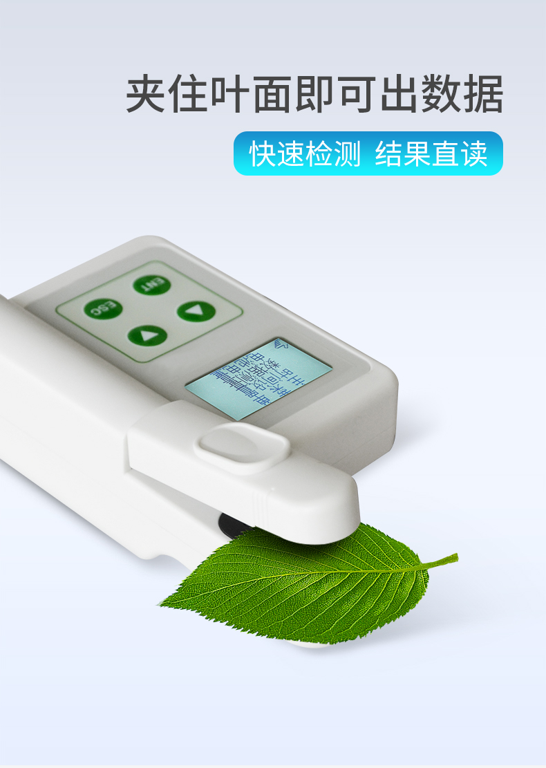 氮素含量一般情況下直接反應(yīng)作物的健康情況,生長(zhǎng)狀態(tài)、了解植物真實(shí)的硝基需求量和土壤硝基的缺乏程度或是否過(guò)多地施加了氮肥,廣泛應(yīng)用于氮肥管理,除草劑應(yīng)用,葉片衰老,環(huán)境脅迫等研究,葉綠素測(cè)量?jī)x在農(nóng)業(yè)種植過(guò)程中有很大的意義。 葉 綠素含量的測(cè)定結(jié)果是SPAD值,是葉片在兩種波長(zhǎng)650nm 和940nm,葉片傳輸光的數(shù)量進(jìn)行比值計(jì)算,來(lái)確定葉片當(dāng)前葉綠素的相對(duì)數(shù)量(兩種波長(zhǎng)范圍內(nèi)的透光系數(shù)來(lái)確定葉片當(dāng)前葉綠素的相對(duì)數(shù)量 ),SPAD值與葉綠素之間成正比關(guān)系,因此SPAD值往往間接地可代表葉綠素值,從而可以評(píng)估植物健康狀況、生長(zhǎng)狀態(tài),因而在農(nóng)業(yè)中,時(shí)常使用葉綠素計(jì) 來(lái)進(jìn)行對(duì)植物葉綠素含量進(jìn)行檢測(cè),以此來(lái)進(jìn)行指導(dǎo)氮肥的施用量,因而在農(nóng)業(yè)種植過(guò)程中使用葉綠素計(jì)來(lái)進(jìn)行指導(dǎo)氮元素含量的施肥,同時(shí)在很多植物中,以此來(lái) 進(jìn)行判斷植物的抗逆性。 葉溫常用來(lái)表示植物的體溫狀況,植物葉片中所有的化學(xué)反應(yīng),都受葉片溫度的影響,在植物生理活動(dòng)的分析中經(jīng)常用到。葉溫與 氣溫的差值,可以表明植物的缺水情況或受旱程度。因?yàn)楫?dāng)水分供應(yīng)充足時(shí),植物蒸騰正常,蒸騰耗熱可以降低植物體溫,這時(shí)葉溫比氣溫低;反之受旱時(shí),植物體 溫上升,可高于當(dāng)時(shí)的氣溫。