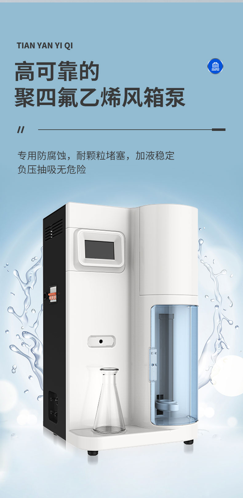 | 1. 采用國家標準的凱氏定氮方法,濃硫酸環(huán)境消解樣品、堿性環(huán)境蒸汽蒸餾、硼酸吸收、指示劑滴定終點顏色判斷法。并參與國家標準GB/T22923-2008、官方JJF109-2012《定氮儀校準規(guī)范》的起草; | 1. ☆自動添加稀釋水、試劑(堿液和吸收液)、蒸餾、配有計算軟件,計算結果方便快捷; | 2. 彩色液晶觸摸屏,蒸餾時間與試劑添加通過屏幕設定,條件可自動保存; | 3. 節(jié)水設計,循環(huán)水流量≥1.5L/min只在蒸餾過程開啟循環(huán)水, 冷卻循環(huán)水流量實時監(jiān)控,低水壓報警顯示,停水自動終止運行提示; | 4. 安全門到位、消化管到位、蒸汽爐液位、蒸汽爐溫度、冷卻水溫度監(jiān)測和提示; | 5. 采用成熟穩(wěn)定的蒸汽發(fā)生器技術,自動預熱、補水,自動控制蒸汽壓力,自動防干燒,自動清洗; | 6. 自動控制蒸汽壓力在安全范圍之內,遠離蒸汽過壓危險; | 7. 雙蒸餾模式,手動與自動任意切換; | 8. ☆采用高可靠的聚四氟乙烯風箱泵,專用防腐蝕,耐顆粒堵塞,加液穩(wěn)定,負壓抽吸無危險; | 9. ☆采用ABS工程塑料面板,耐腐蝕、防水、防電; | 10. 貼合氨逸出規(guī)律特殊設計的蒸餾系統(tǒng),確保高可靠的測試回收率; | 11. 消化管周邊設施智能化設計,透明亞克力保護罩,將危險徹底隔離; | 12. 蒸汽發(fā)生器具有壓力傳感器、溫度傳感器、溫度保護開關、水位雙重檢測等多重保護。 | 14.儀器具備自查功能,可以檢測各項功能是否正常 |