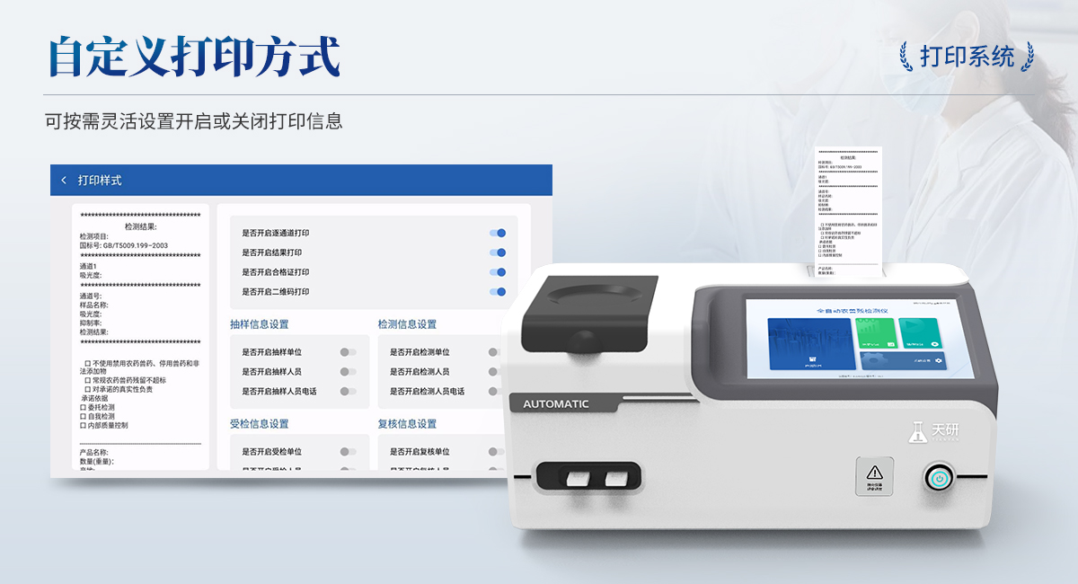 | 1. 試劑位置:3個 | 2. 農殘檢測盤:旋轉24通道比色盤,可任意選擇檢測通道,自動對應選擇通道。 | 3. 膠體金通道:2個,可讀取檢測卡結果,自動采集、處理分析,自動判斷檢測結果,并具備自動判空功能。 | 4.系統配置:10.1寸高清液晶觸摸屏,采用ARM Cortex?-A7,RK3288/4核處理器,運行內存1GB。Android7.1.1 系統分辨率1280×800。 | 5.恒溫系統:具有自動加溫溫控系統,精準恒溫37℃,精度±0.1℃。 | 6.添加系統:儀器按照試劑要求自動、按時、按量加入試劑,并且自動對未正常放置的樣本或異常的樣本進行檢查并提示。 | 7.清洗功能:儀器具備回流及自動清洗管路功能,避免試劑污染。 | 8.混勻功能:設備具備自動混勻功能。 | 9.光源校準:設備可自動校準,確保檢測準確度。 | 10.實時監(jiān)控:儀器測試過程中屏幕顯示運行狀態(tài),可實時查看。 | 11.數據存儲:內部存儲16GB,可存儲500萬條數據。 | 12.樣品多選功能:設備具備樣品一鍵多選功能,選擇樣品自動匹配檢測通道。 | 13.項目預設:可提前設置單個及多個相同或不相同的檢測任務,可單次或者多次調取,減少檢測時間。 | 14.自定義打印系統:內置自定義打印系統,可按需靈活設置開啟或關閉:產品合格證(國家農業(yè)部標準),二維碼,抽樣信息、檢測信息,受檢信息等信息的打印。 | 15.A4版本報告打印功能:設備可自動生成A4版報告,A4報告帶二維碼,可掃描二維碼生成電子版,并可識別真?zhèn)巍?/td> | 16.傳輸方式:儀器配備無線通信模塊: 4G(APN)通訊模塊、Wifi模塊,藍牙傳輸模塊,同時具有USB接口以及RJ45接口能以多種方式實現數據保存和數據傳輸功能,設備數據可以同步上傳至平臺。 | 17.系統17.數據監(jiān)管系統:設備自帶監(jiān)管平臺,并可同步對接監(jiān)管平臺,數據可局域網和互聯網數據上傳,檢測結果可直接傳至食品安全監(jiān)管平臺。達到食品安全問題預估、預警。 | 18.系統遠程更新功能:無需設備返廠,即可遠程實時升級全新系統,節(jié)省時間成本及避免運輸造成設備損。 |