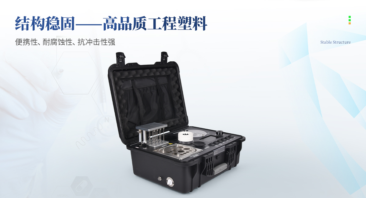 | 1、功能緊湊,集成五種樣品前處理常用的功能,完成樣品一站式處理。 | 2、結(jié)構(gòu)穩(wěn)固,機箱采用***工程塑料,具備**的抗沖擊性、耐腐蝕性、便攜性。 | 3、操作穩(wěn)定,機器采用五寸全彩色液晶屏,功能指示性強,用戶操作均為實體開關(guān),杜絕佩戴手套和液體噴濺時的操作失效。 |