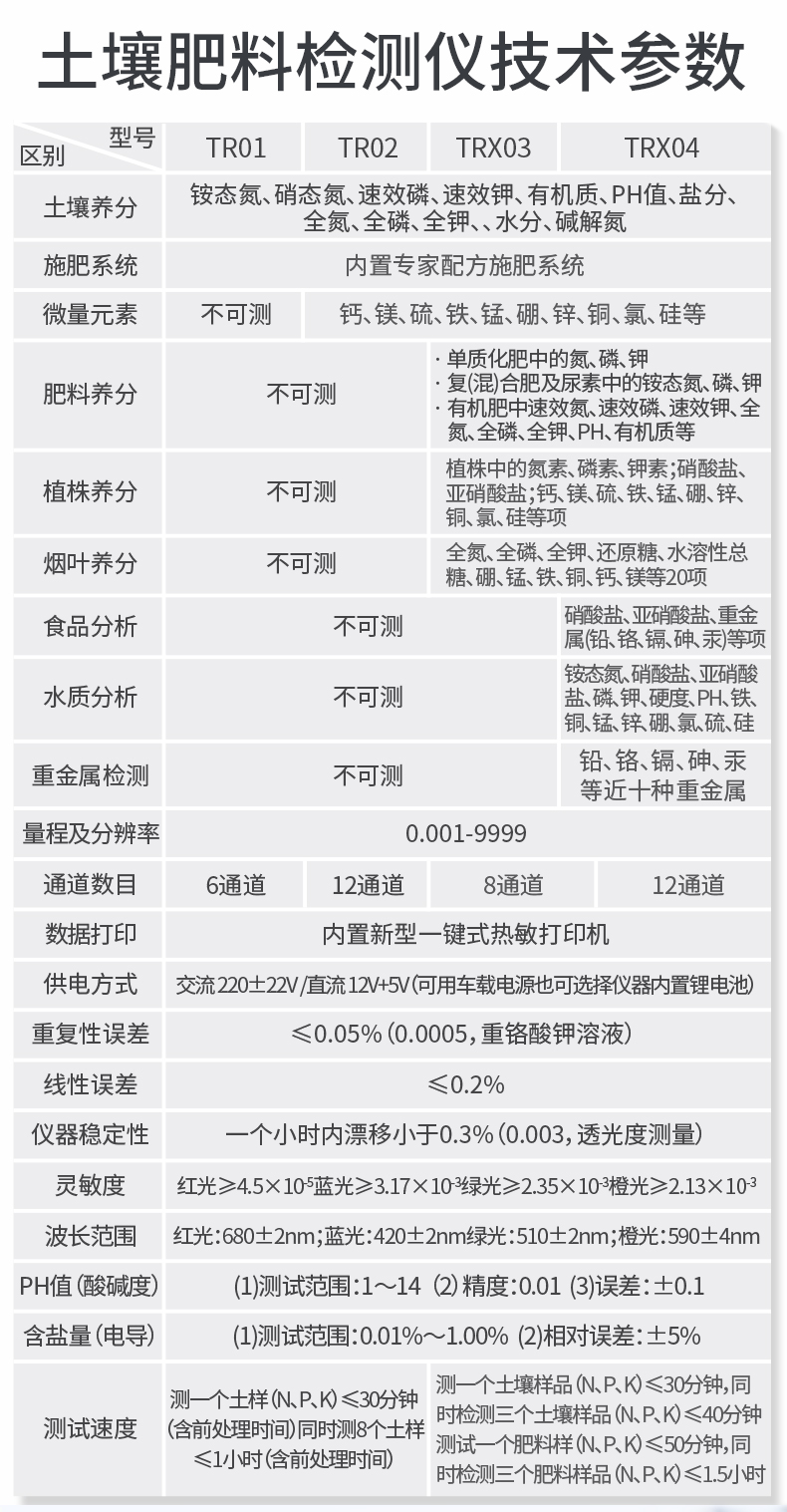 | ★1、Android安卓智能操作系統(tǒng),主控芯片采用ARM Cortex-A7,RK3288/4核處理器,主頻1.88Ghz,運轉(zhuǎn)速度更快速,穩(wěn)定性更強。 | ★2、18個檢測通道,一次性可快速檢測18個樣品,極大提升檢測效率,降低檢測成本。 | ★3、采用高精度濾光片技術自主**分析方法(**號:ZL 2020 2 1763837.9),**認證。 | ★4、檢測過程中內(nèi)置校準功能,智能恒流穩(wěn)壓,光強自動校準,確保檢測準確度,取得中國計量科學研究院的《校準證書》。 | ★5、儀器標配wifi無線上傳、4G聯(lián)網(wǎng)傳輸、GPRS無線遠傳,快速上傳數(shù)據(jù)。 | ★6、配有智慧云農(nóng)業(yè)平臺,儀器連入無線網(wǎng)絡后,可將檢測數(shù)據(jù)可選擇性或批量無線上傳,方便用戶進行長期數(shù)據(jù)管理和可視化分析。 | 7、儀器配同時具有USB接口、以太網(wǎng)接口,內(nèi)置大容量內(nèi)存,并可隨時用U盤拷貝數(shù)據(jù)。 | ★8、可用手機隨時登錄云平臺在線移動查看歷史數(shù)據(jù) | ★9、內(nèi)置作物專家施肥系統(tǒng),可對百余種全國農(nóng)業(yè)經(jīng)濟作物、果樹等的目標產(chǎn)量計算推薦施肥量,依據(jù)施肥配方科學指導農(nóng)業(yè)生產(chǎn)。測土配方施肥結(jié)果可打印,打印內(nèi)容包含:作物種類、肥料種類、目標產(chǎn)量、需求總量、建議施肥方案。 | 10、內(nèi)置植物營養(yǎng)診斷標準圖譜,根據(jù)各農(nóng)作物營養(yǎng)缺失的圖片,進行葉面對比,診斷豐缺。 | ★11、4波長專業(yè)測試冷光源(紅、藍、綠、橙),光源波長穩(wěn)定,長時間連續(xù)工作光源無溫漂現(xiàn)象,壽命長達10萬小時級別,重現(xiàn)性好,準確度高。 | 12、比色池部分采用標準1cm比色皿,無機械位移及磨損,光路測試定位**,有效屏蔽外光干擾,保證檢測結(jié)果優(yōu)于國標要求。 | ★13、儀器系統(tǒng)內(nèi)帶有樣品前處理操作視頻,各種樣品檢測方法點擊視頻模塊即可觀看,檢測人員無需自學說明書,指導教學方便快速,方便新手快速操作。 | 14、內(nèi)置新一代高速熱敏打印機(無需色帶),打印內(nèi)容包含:檢測單位、檢測人員、檢測項目、通道號、吸光度、養(yǎng)分含量(mg/kg)、檢測時間、以及二維碼等信息 | ★15、高靈敏7寸真彩觸摸屏,采用更加**和人性化操作,高清晰高交互顯示,大程度降低傳統(tǒng)儀器的繁瑣操作和失誤,并取得多項《軟件著作權(quán)》。 | 16、內(nèi)置時鐘功能,方便操作時間記錄,長期歷史追溯。 | 17、可設置多賬戶賬號密碼登錄,**UI交互界面,不同的用戶可自由添加編輯檢測信息,保存后可長期使用。 | 18、GPS功能:可在野外作業(yè)時記錄經(jīng)緯度地點,滿足特殊用戶需求。 | 19、內(nèi)置低電壓提示功能,可在檢測時明確電量,避免測試數(shù)據(jù)偏移,同時具有斷電保護功能,斷電自動保存數(shù)據(jù),防止數(shù)據(jù)丟失。 | 20、交直流兩用供電方式,內(nèi)置大容量充電鋰電池,滿電狀態(tài)下可連續(xù)工作10余小時,同時可外接車載電源蓄電。 | ★21、儀器具有中英文切換功能,可滿足出口要求。 | 22、高強度PVC工程塑料手提箱設計,堅固耐用,便于攜帶。 |