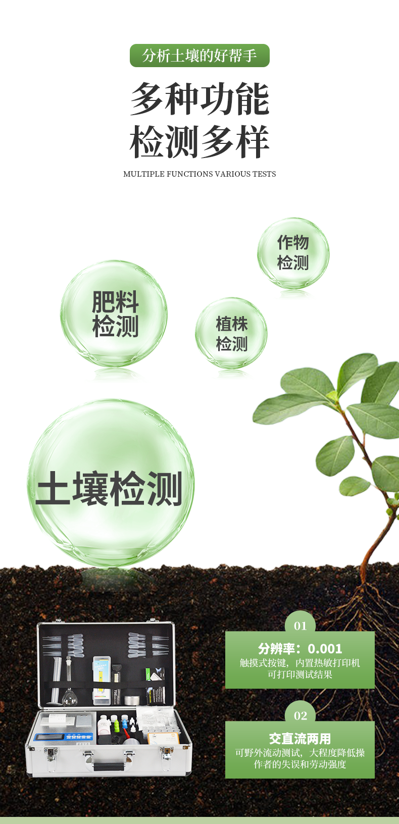 | 1、《機箱/藥劑一體式鋁合金機箱》設(shè)計,便于攜帶、堅固耐用,配套成品藥劑。 | 2、微電腦控制,數(shù)字化線路、程序化設(shè)計,液晶顯示,交直流兩用,可野外流動測試,大程度降低操作者的失誤和勞動強度。 | 3、分辨率:0.001,觸摸式按鍵,內(nèi)置熱敏打印機,可打印測試結(jié)果。 | 4、可檢測土壤及化肥、有機肥、植株中的速效氮、有效磷、速效鉀、全氮、全磷、全鉀、有機質(zhì)含量,土壤酸堿度,含鹽量(擴展)。 | 5、土壤養(yǎng)分速測儀采用高亮度 LED 燈作為光源, 硅半導體作為信號接收系統(tǒng), 壽命長達10萬小時級別。光源穩(wěn)定,一致性好。 | 6、比色槽部分采用單通道、雙光路設(shè)計,無機械位移及磨損,光路測試定位**,保證測定結(jié)果精度。 |