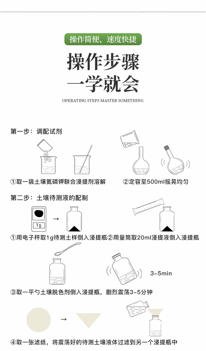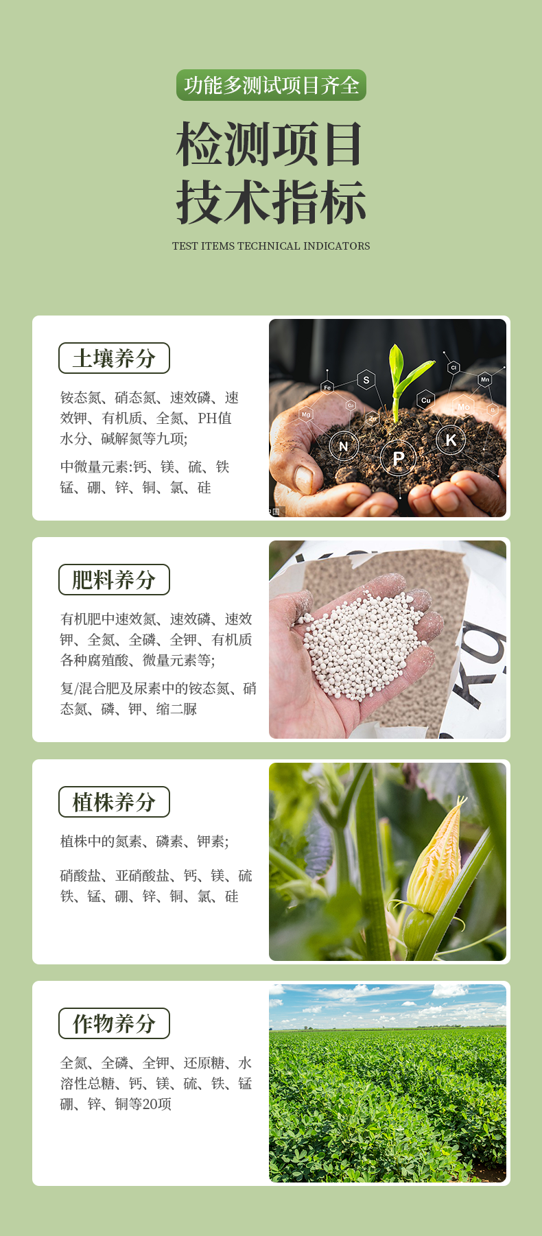 | 土壤養(yǎng)分:● 銨態(tài)氮、速效磷、速效鉀、水份、有機質(zhì)、酸堿度(pH試紙法)等項; | 肥料養(yǎng)分:● 單質(zhì)化肥中的氮、磷、鉀; ● 復(混)合肥及尿素中的銨態(tài)氮、磷、鉀; ● 有機肥中速效氮、速效磷、速效鉀、全氮、全磷、全鉀、pH、有機質(zhì)等。 |