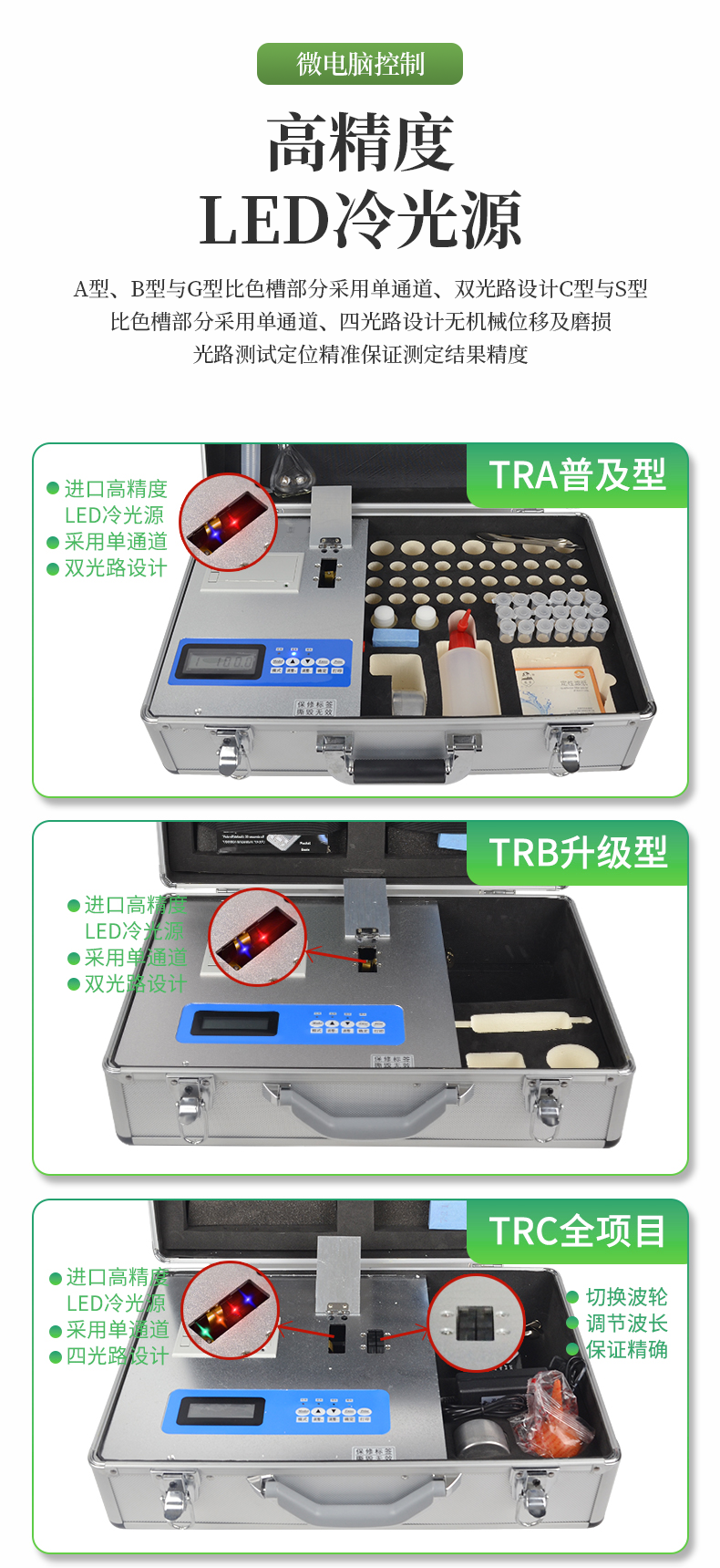 | 1、《機(jī)箱/藥劑一體式鋁合金機(jī)箱》設(shè)計(jì),便于攜帶、堅(jiān)固耐用,配套成品藥劑。 | 2、微電腦控制,數(shù)字化線路、程序化設(shè)計(jì),液晶顯示,交直流兩用,可野外流動(dòng)測(cè)試,**程度降低操作者的失誤和勞動(dòng)強(qiáng)度。 | 3、分辨率:0.001,觸摸式按鍵,內(nèi)置熱敏打印機(jī),可打印測(cè)試結(jié)果。 | 4、可檢測(cè)土壤及化肥、有機(jī)肥、植株中的速效氮、有效磷、速效鉀、全氮、全磷、全鉀、有機(jī)質(zhì)含量,土壤酸堿度,含鹽量,以及土壤鈣、鎂、硫、硼、氯、硅等6種中微量元素。 | 5、采用高亮度 LED 燈作為光源, 硅半導(dǎo)體作為信號(hào)接收系統(tǒng), 壽命長(zhǎng)達(dá)10萬(wàn)小時(shí)級(jí)別。光源穩(wěn)定,一致性好。 | 6、比色槽部分采用單通道、雙光路設(shè)計(jì),無(wú)機(jī)械位移及磨損,光路測(cè)試定位**,保證測(cè)定結(jié)果精度。 |