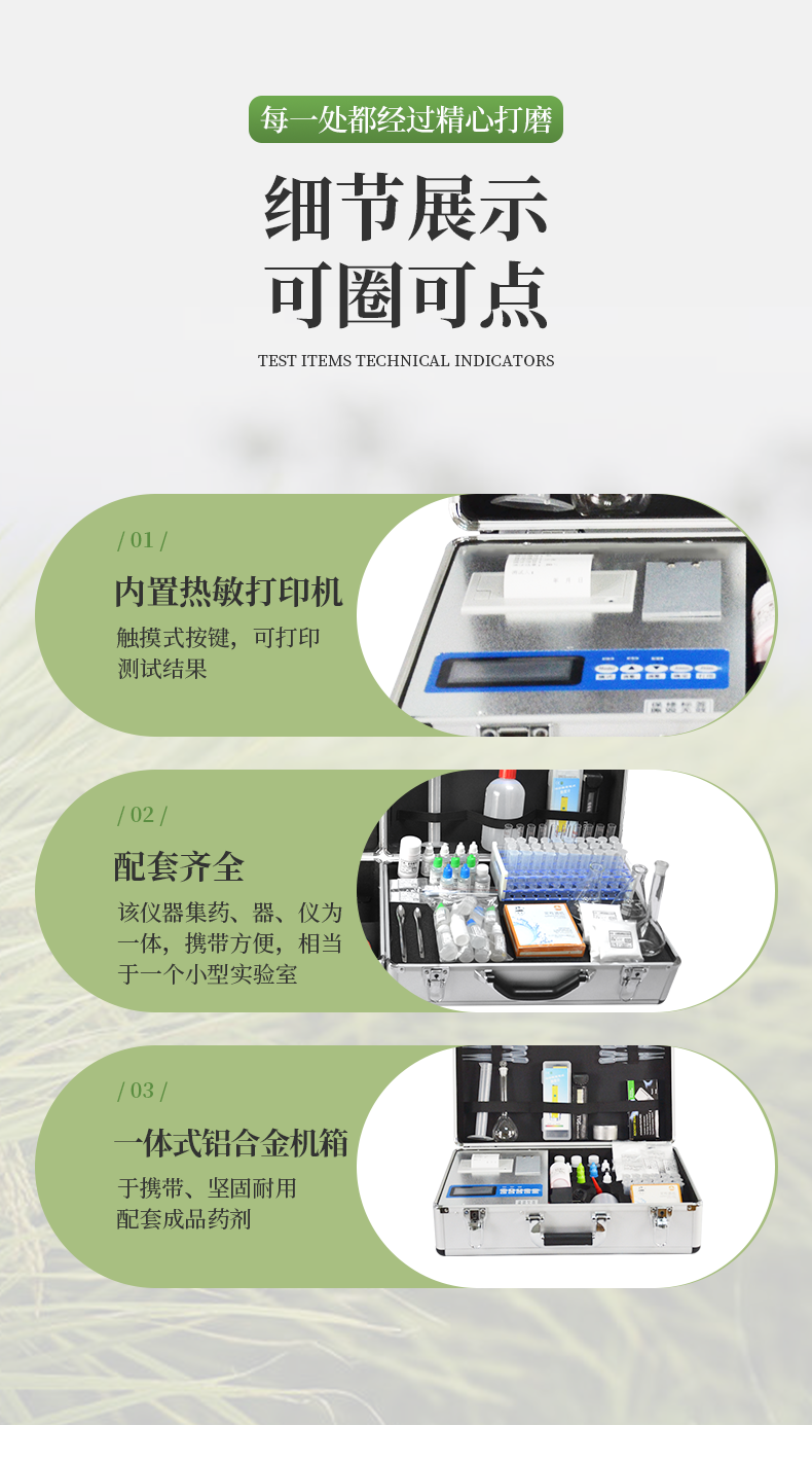 | 儀器整機(jī)質(zhì)保五年,終身免費(fèi)維修服務(wù),免費(fèi)郵寄儀器、免費(fèi)培訓(xùn)、免費(fèi)提供檢測(cè)試劑。 | 終身免費(fèi)提供土肥等農(nóng)業(yè)相關(guān)技術(shù)支持! | 配置清單(兩個(gè)鋁合金箱子): |