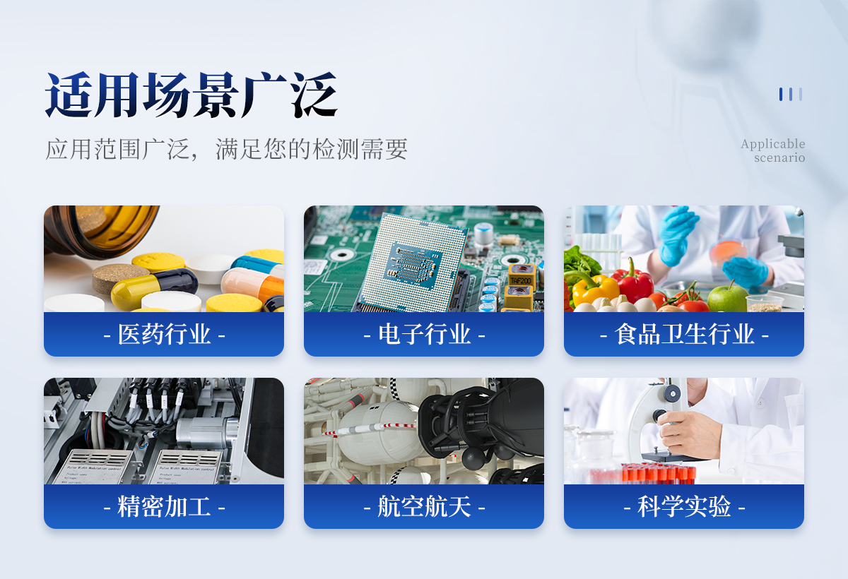 滿足醫(yī)藥行業(yè)(制藥廠、藥檢所、醫(yī)院手術室等);電子行業(yè)(半導體工廠、精密機械的生產加工等);食品衛(wèi)生行業(yè)(乳制品、塑封肉食品、調味食品、農產品等的精加工);過濾器的生產廠家,檢驗過濾器的質量及效率等;光學、及航空航天等領域的精加工、精密試驗所需的潔凈室(區(qū))的檢測需要。