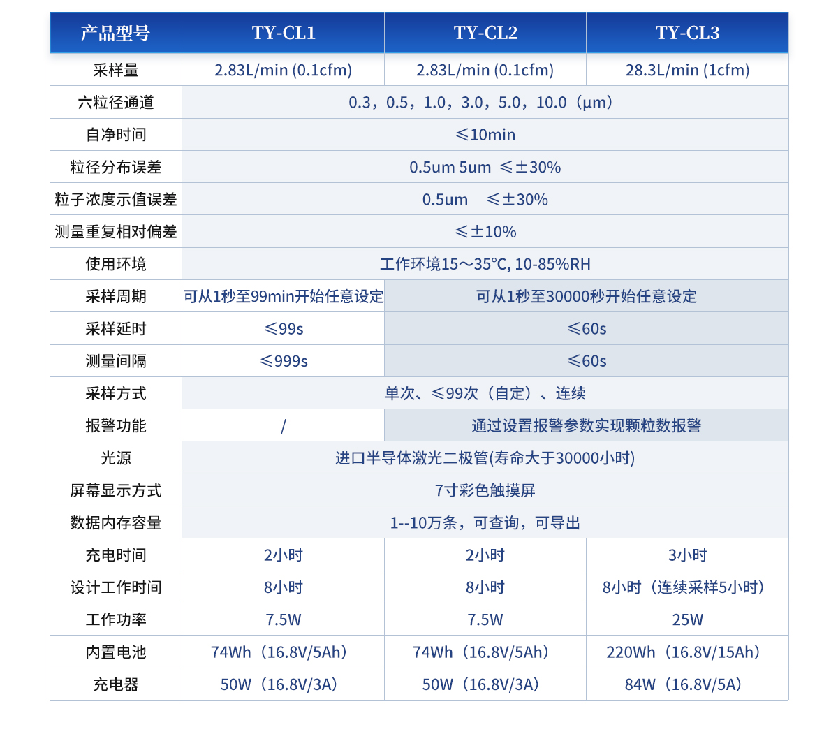 | 采樣量:2.83L/min (0.1cfm) | 六粒徑通道:0.3,0.5,1.0,3.0,5.0,10.0(μm) | 自凈時間:≤10min | 粒徑分布誤差:0.5um 5um ≤±30% | 粒子濃度示值誤差:0.5um ≤±30% | 測量重復相對偏差:≤±10% | 使用環(huán)境:工作環(huán)境15~35℃, 10-85%RH | 采樣周期:可從1秒至99min開始任意設定 | 采樣延時:≤99s | 測量間隔:≤999s | 采樣方式:單次、≤99次(自定)、連續(xù) | 光源:進口半導體激光二極管(壽命大于30000小時) | 屏幕顯示方式:7寸彩色觸摸屏 | 數(shù)據(jù)內存容量:1--10萬條,可查詢,可導出。 | 充電時間:2小時 | 設計工作時間:8小時 | 平均功率:7.5W | 內置電池:74Wh(16.8V/5Ah) | 充電器:50W(16.8V/3A) |
