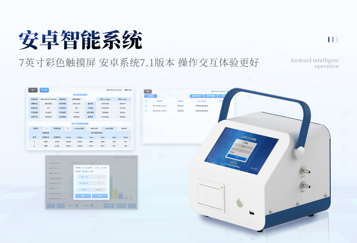 | 1、安卓系統(tǒng)7.1版本,操作交互體驗更好。 | 2、內置溫濕度傳感器、環(huán)境氣壓傳感器 | 3、核心部件光散射傳感器明顯消除腔體的雜散光,信噪比大為提高。從而使測量更準確更可靠。 | 4、按95%置信度(UCL)計算,計數(shù)結果可換算成m3和ft3 | 5、依照凈化級別劃分和規(guī)定,自動判定凈化級別,使用便利。 | 6、支持wifi、藍牙傳輸,數(shù)據(jù)可無線上傳;同時支持U盤拷貝數(shù)據(jù),免驅動插拔。 | 7、配置監(jiān)管平臺,檢測結果可直接無線傳至平臺,進行潔凈度長短期分析,輔助管理。 | 8、內置新一代高速熱敏打印機,可選擇所需要打印的粒徑通道,靈活打印結果。 | 9、交直流兩用,內置充電鋰電池,環(huán)保耐用可支持連續(xù)采樣6小時以上。 | 10、便捷簡易伸縮式云臺支架,安裝采樣操作更加方便。 |