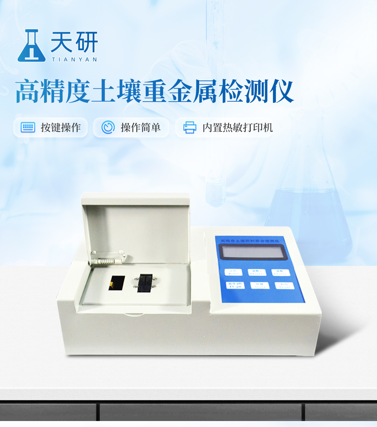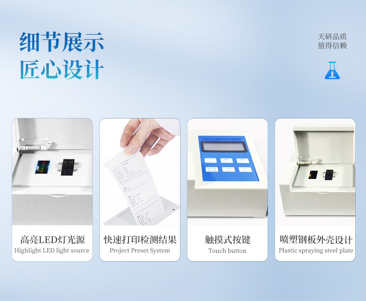 | 性能可靠,工作穩(wěn)定性均優(yōu)于國家標(biāo)準(zhǔn)JJG79-90標(biāo)準(zhǔn)5--6倍,重復(fù)性達(dá)到光柵類分光光度計(jì)指標(biāo),采用微處理器技術(shù),單片機(jī)控制,觸摸按鍵,操作簡(jiǎn)便。 | 重金屬測(cè)試采用聯(lián)合消化和分項(xiàng)測(cè)試技術(shù),簡(jiǎn)化測(cè)試流程,減少測(cè)試時(shí)間,大大提高測(cè)試效率,提高測(cè)試精度。 | 擴(kuò)展性強(qiáng),該儀不僅可以專用于重金屬的檢測(cè)還可以擴(kuò)展測(cè)定土壤、肥料、植株中養(yǎng)分的測(cè)試(HM-ZSA型),一機(jī)多用。 | 土壤重金屬檢測(cè)儀集藥,器,儀于一體,相當(dāng)于一個(gè)小型實(shí)驗(yàn)室, 兩個(gè)鋁合金箱體,易于攜帶,便于現(xiàn)場(chǎng)測(cè)試,流動(dòng)服務(wù)。適于基層檢測(cè)部門對(duì)含有重金屬污染的蔬菜、水果等食品進(jìn)行篩選。 |