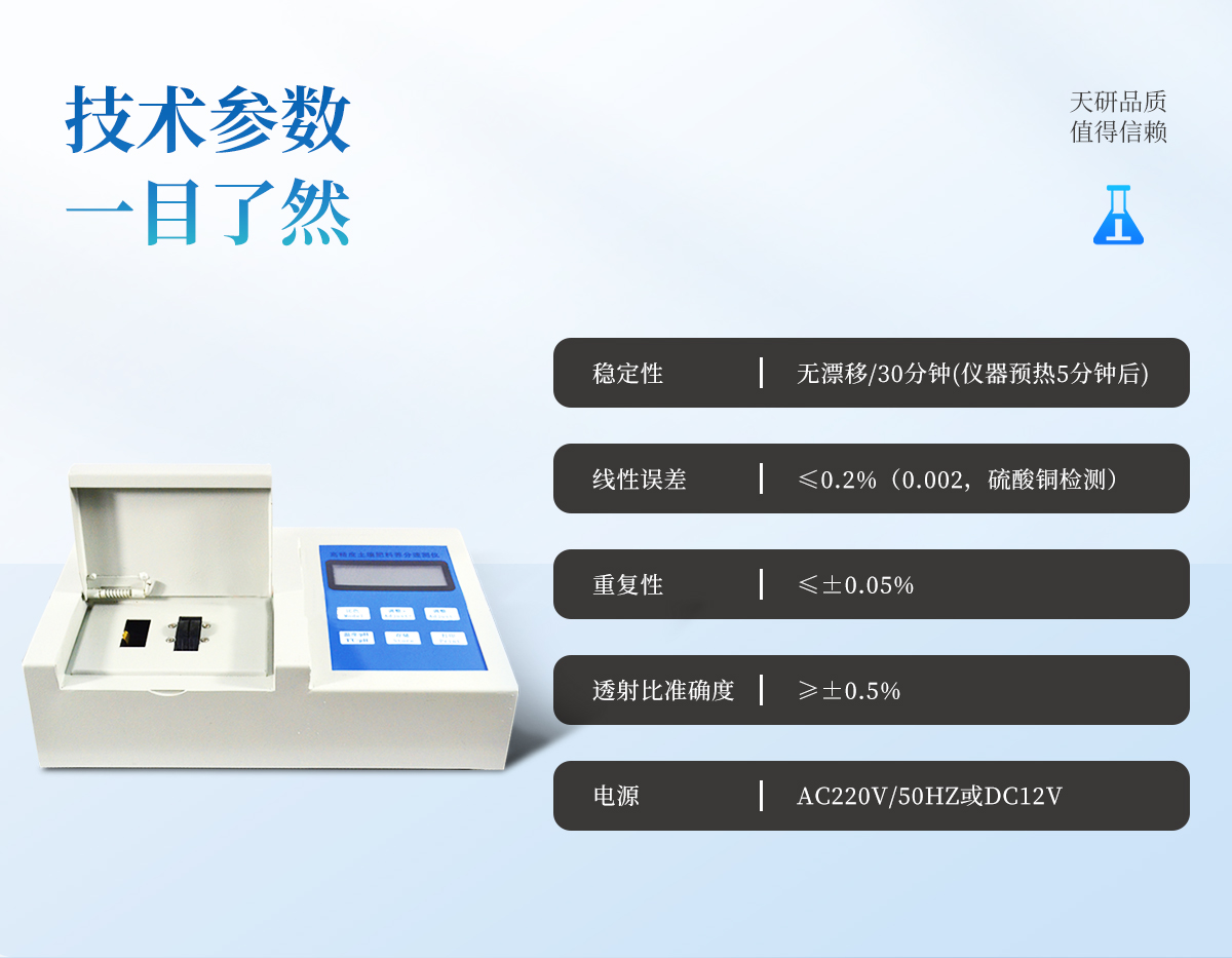 | 儀器透射比準(zhǔn)確度 ≥±0.5% | 儀器重復(fù)性 ≤±0.05% | 儀器穩(wěn)定性 無漂移/30分鐘(儀器預(yù)熱5分鐘后) | 線性誤差 ≤0.2%(0.002,硫酸銅檢測(cè)) | 儀器功耗 ≤5W | 電源 AC220V/50Hz或DC12V | 結(jié)果輸出 內(nèi)置**熱敏打印機(jī)可自動(dòng)打印出檢測(cè)結(jié)果,方便直觀。 |