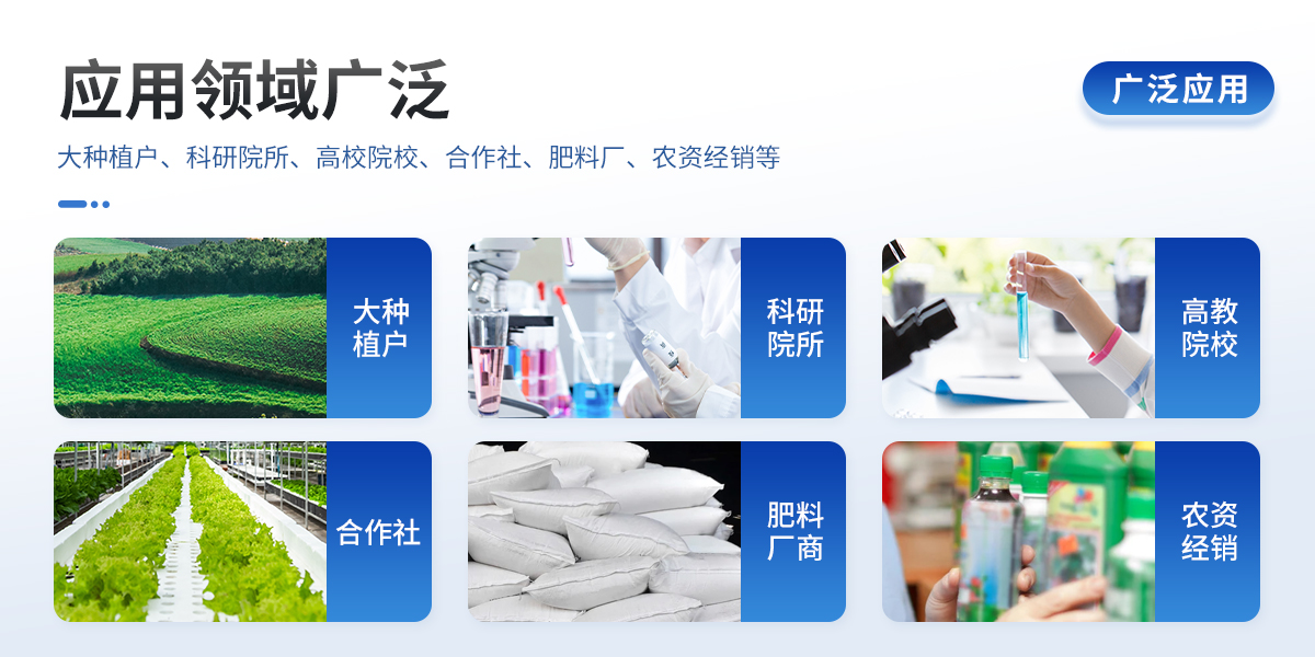 | 1、土壤養(yǎng)分:			   ●土壤總有機(jī)碳TOC、土壤碳氮比、銨態(tài)氮、土壤有效磷、土壤速效鉀、土壤硝態(tài)氮、土壤水解氮、土壤全氮、土壤全磷、土壤全鉀、土壤有機(jī)質(zhì)(丘林法)、土壤有機(jī)質(zhì)(浸提法)、PH值、含鹽量、水分。 ●土壤中微量元素:土壤鈣、土壤鎂、土壤硫、土壤硅、土壤硼、土壤鐵、土壤銅、土壤錳、土壤鋅、土壤氯; ●土壤重金屬:土壤鉛、土壤砷、土壤鎘、土壤鉻、土壤汞。  | 2、肥料養(yǎng)分:			   ●有機(jī)肥總有機(jī)碳TOC、有機(jī)肥碳氮比、全氮、有機(jī)肥全磷、有機(jī)肥全鉀、有機(jī)肥硝態(tài)氮、有機(jī)肥速效磷、有機(jī)肥速效鉀、有機(jī)肥酸解氮、有機(jī)質(zhì); ●復(fù)合肥碳氮比、全氮、復(fù)合肥全磷、復(fù)合肥全鉀; ●水溶肥碳氮比、全氮、水溶肥全磷、水溶肥全鉀; ●葉面肥碳氮比、全氮、葉面肥全磷、葉面肥全鉀; ●水溶性腐植酸(風(fēng)化煤)、水溶性腐植酸(褐煤)、水溶性腐植酸(泥炭)、游離態(tài)腐植酸(風(fēng)化煤)、游離態(tài)腐植酸(褐煤)、游離態(tài)腐植酸(泥炭); ●單質(zhì)肥:氮肥中銨態(tài)氮、肥料硝態(tài)氮、尿素氮、縮二脲、磷肥中磷、磷肥中水溶性磷、鉀肥中鉀; ●各種肥料微量元素:肥料鈣、肥料鎂、肥料硫、肥料硅、肥料硼、肥料鐵、肥料銅、肥料錳、肥料鋅、肥料氯; ●肥料重金屬:肥料鉛、肥料砷、肥料鎘、肥料鉻、肥料汞。  |
