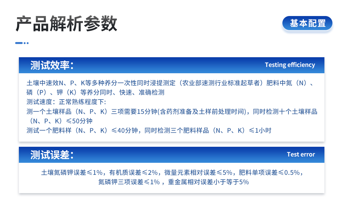 | 土壤中速效N、P、K等多種養(yǎng)分一次性同時(shí)浸提測定(農(nóng)業(yè)部速測行業(yè)標(biāo)準(zhǔn)起草者)。 | 肥料中氮(N)、磷(P)、鉀(K)等養(yǎng)分同時(shí)、快速、準(zhǔn)確檢測。 | 測試速度:正常熟練程度下: | 測一個(gè)土壤樣品(N、P、K)三項(xiàng)需要20分鐘(含藥劑準(zhǔn)備及土樣前處理時(shí)間),同時(shí)檢測三個(gè)土壤樣品(N、P、K)≤40分鐘,同時(shí)測8個(gè)土樣≤1小時(shí)。 | 測試一個(gè)肥料樣(N、P、K)≤50分鐘,同時(shí)檢測三個(gè)肥料樣品(N、P、K)≤1.5小時(shí)。 |