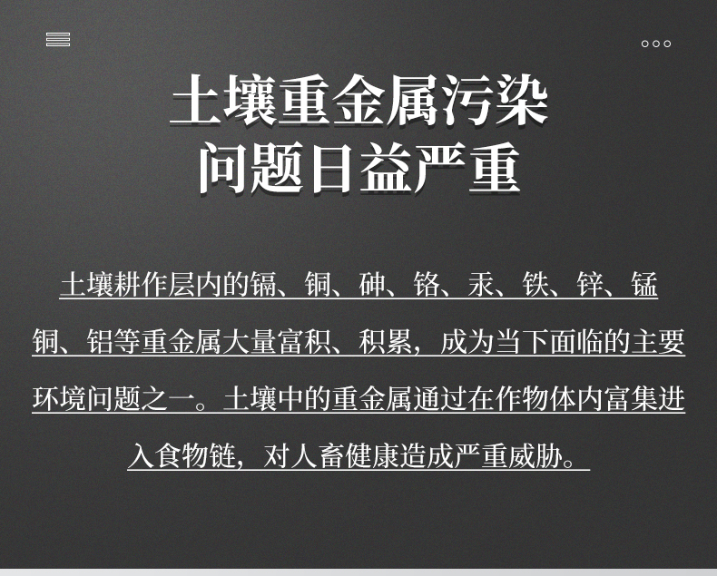 簡(jiǎn)述: 土壤重金屬污染問題日益嚴(yán)重,造成土壤耕作層內(nèi)的鎘、銅、砷、鉻、汞、鐵、鋅、錳、銅、鋁等重金屬大量富積、積累,成為當(dāng)下面臨的主要環(huán)境問題之一。土壤中的重金屬通過在作物體內(nèi)富集進(jìn)入食物鏈,對(duì)人畜健康造成嚴(yán)重威脅。有色金屬礦山的開采、 工業(yè)“三廢”的排放、含重金屬?gòu)U棄物堆積、農(nóng)業(yè)生產(chǎn)中
