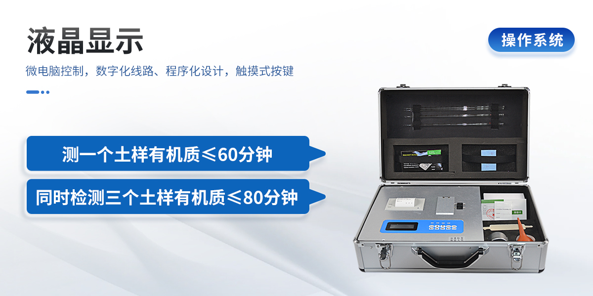 | 配套齊全:土壤有機質(zhì)速測儀該儀器集藥、器、儀為一體,攜帶方便,相當(dāng)于一個小型實驗室。適于農(nóng)業(yè)服務(wù)部門或農(nóng)資經(jīng)銷商、肥料廠商測土施肥和鑒別肥料真假。 | 操作簡便、速度快捷,成品藥劑開瓶即用,無須配置。 | 性能可靠:工作穩(wěn)定性優(yōu)于國家標(biāo)準(zhǔn)JJG179-90指標(biāo)的6倍,重復(fù)性達到光柵型分光光度計指標(biāo)水平。 |