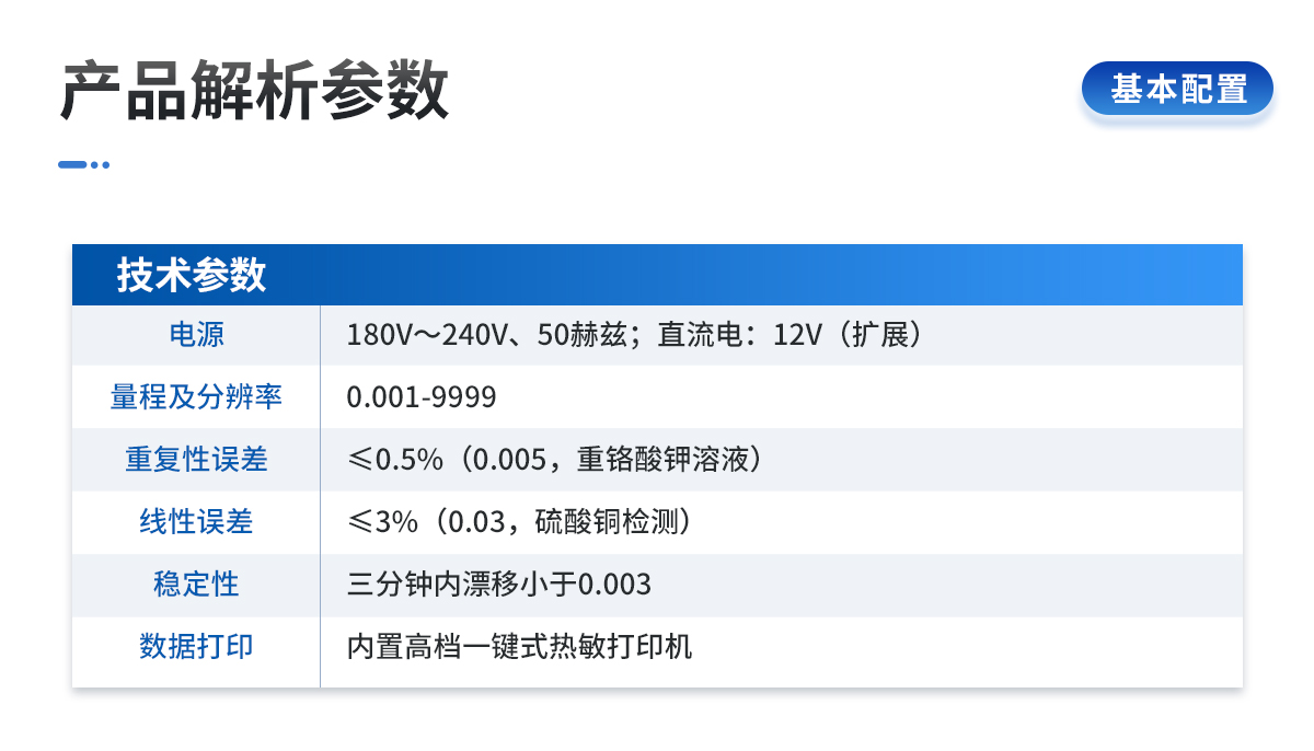 | 電源:交流電:180V~240V、50赫茲;直流電:12V(擴展) | 量程及分辨率:0.001-9999 | 穩(wěn)定性:三分鐘內(nèi)漂移小于0.003 | 線性誤差:≤3%(0.03,硫酸銅檢測) | 重復(fù)性誤差:≤0.5%(0.005,重鉻酸鉀溶液) | 靈敏度:紅光≥4.5 ×10-5 藍光≥3.17×10-3 | 波長范圍:紅光620±8nm 藍光440±8nm | 測試速度:測一個土樣有機質(zhì)≤60分鐘(含前處理時間) | 可同時檢測8個土樣≤個小時(含前處理時間) | 數(shù)據(jù)打?。簝?nèi)置高檔一鍵式熱敏打印機(國內(nèi)首家**設(shè)計) |