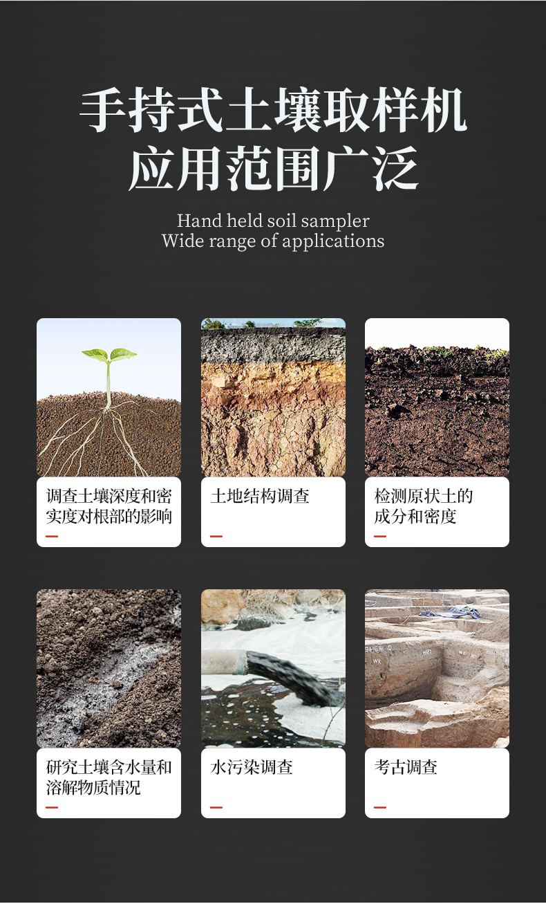 | 土壤結(jié)構(gòu)描述 | 調(diào)查根系情況,獲取深度和密實度對根部影響 | 檢測原狀土的成分和密度 | 對長期作業(yè)的土壤研究其含水量和溶解物質(zhì)情況 | 對水的流動和溶解物質(zhì)的研究,如土壤中水分快速流失現(xiàn)象 | 考古調(diào)查 |