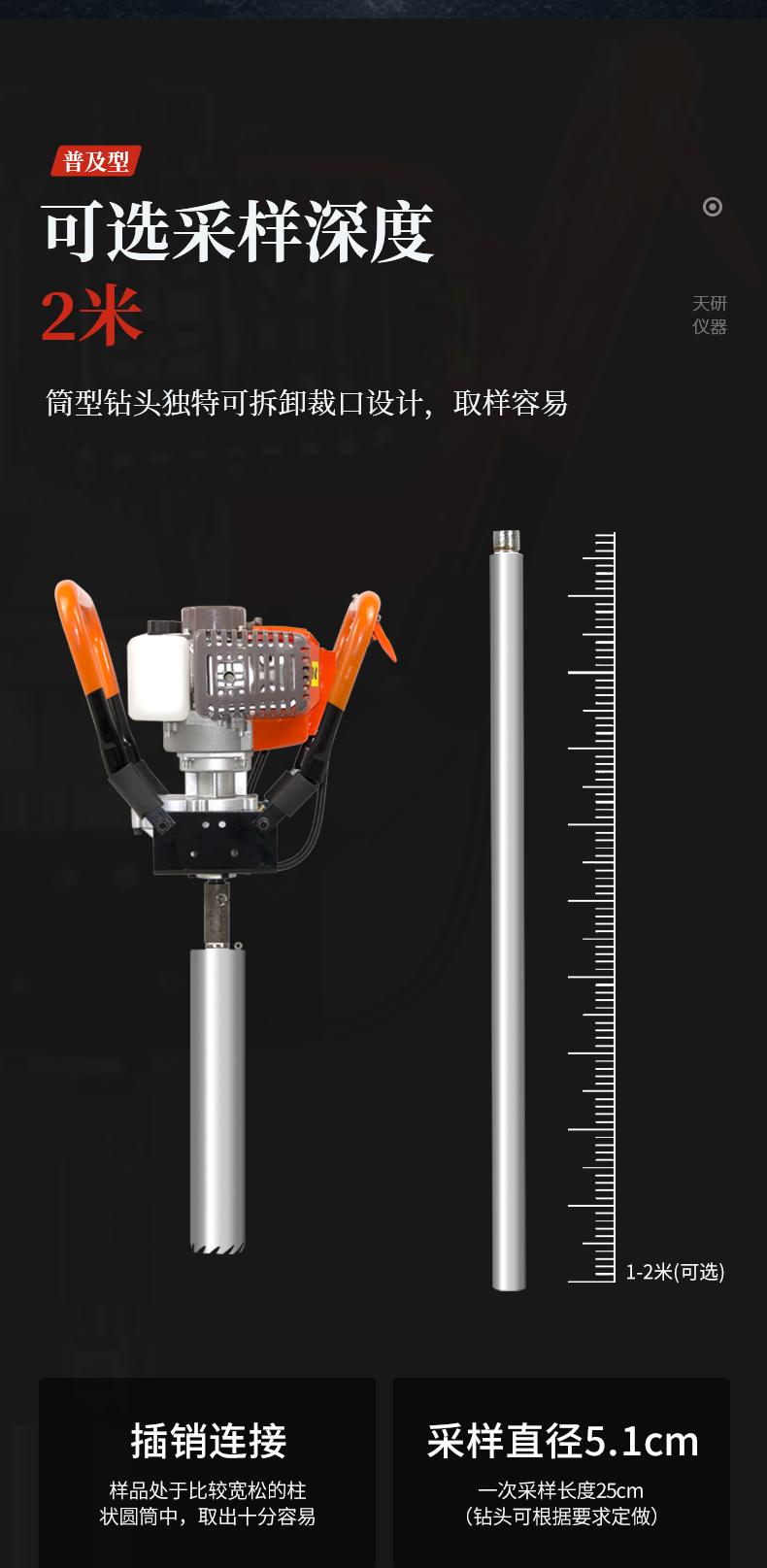 | 規(guī) 格: 采樣直徑5.1cm、一次采樣長度25cm(鉆頭可根據(jù)要求定做) | 采樣深度:2米,延長桿插銷連接。 | 發(fā)動機形式:風(fēng)冷單缸二沖程 | 發(fā)動機排量:52CC | 發(fā)動機功率:1.9kw/7000r/min | 齒輪箱配置:采用齒輪二級變速,軸承轉(zhuǎn)動 | 傳動方式:齒輪變速傳動 | 啟動方式:手拉反沖起動 | 燃油比:93號汽油與二沖程機油25:1 | 燃油箱容積:1200ml | 凈 重:20kg |