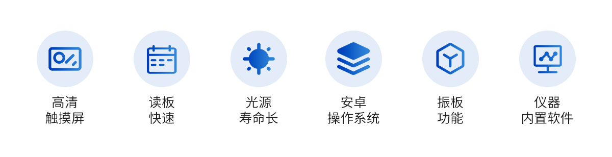 | 1. 高清觸摸屏: 顯示使用7英寸彩色觸摸屏,分辨率為1280*800像素。 | 2.內(nèi)置軟件: 內(nèi)置軟件可提供儀器的控制和數(shù)據(jù)分析,可直接外接U盤(pán)。 | 3. 光源壽命長(zhǎng): 光源采用6V10W鹵素?zé)?,壽命可達(dá)2000h。 | 4. 讀板快速: 采用單波長(zhǎng),雙波長(zhǎng)檢測(cè)讀板快速。 | 5. 振板功能: 根據(jù)使用配置了振板功能,可根據(jù)使用設(shè)置振板時(shí)間和速度。 | 6. 操作系統(tǒng): 配備自主研發(fā)的安卓操作系統(tǒng)可單機(jī)獨(dú)立使用,同時(shí)配置多種數(shù)據(jù) 輸出接口,方便不同的數(shù) 據(jù)傳輸和處理。 | 7. 可視化布板: 并采用可視化布板方式輸出測(cè)試結(jié)果。 | 8. 設(shè)置吸光度范圍:0~4.000Abs,滿(mǎn)足不同測(cè)量要求,并配備了8組濾光片輪,標(biāo)配4組濾光片,根據(jù)使用 可選配340 nm~750nm波長(zhǎng)的濾光片組合使用。設(shè)計(jì)合理無(wú)需打 開(kāi)機(jī)蓋就可更換光源和濾光片。 | 9.檢測(cè)數(shù)據(jù):使用自動(dòng)校準(zhǔn)、定位系統(tǒng)算法使檢測(cè)數(shù)據(jù)更精準(zhǔn)、可靠。 | 10. 配置對(duì)光路: 配置對(duì)光路,機(jī)械運(yùn)動(dòng)等進(jìn)行自檢和診斷校對(duì)功能。 |
