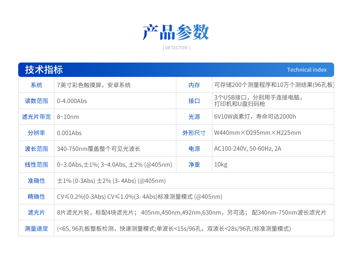 系統(tǒng):7英寸彩色觸摸屏,安卓系統(tǒng) 讀數(shù)范圍:0-4.000Abs 濾光片帶寬:8~10nm 分辨率:0.001Abs 波長(zhǎng)范圍:340-750nm覆蓋整個(gè)可見(jiàn)光波長(zhǎng) 線(xiàn)性范圍:0~3.0Abs,士1%; 3~4.0Abs, 土2% (@405nm) 準(zhǔn)確性:士1% (0-3Abs) 士2% (3- 4Abs) (@405nm) 精 確 性:CV≤0.2%(0-3Abs) CV≤1.0%(3- 4Abs)標(biāo)準(zhǔn)測(cè)量模式 (@405nm) 濾光片:8片濾光片輪,標(biāo)配4塊濾光片; 405nm,450nm,492nm,630nm,另可選; 配340nm-750nm波長(zhǎng)濾光片 測(cè)量速度:小于6S, 96孔板整板檢測(cè),快速測(cè)量模式;單波長(zhǎng)小于15s/96孔,雙波長(zhǎng)小于28s/96孔(標(biāo)準(zhǔn)測(cè)量模式) 內(nèi)存:可存儲(chǔ)200個(gè)測(cè)量程序和10萬(wàn)個(gè)測(cè)結(jié)果(96孔板) 接口:3個(gè)USB接口,分別用于連接電腦,打印機(jī)和U盤(pán)掃碼槍 光源:6V10W鹵素?zé)?,壽命可達(dá)2000h 外形尺寸:W440mm×D295mm×H225mm 電源:AC100-240V, 50-60Hz, 2A 凈重:10kg  |