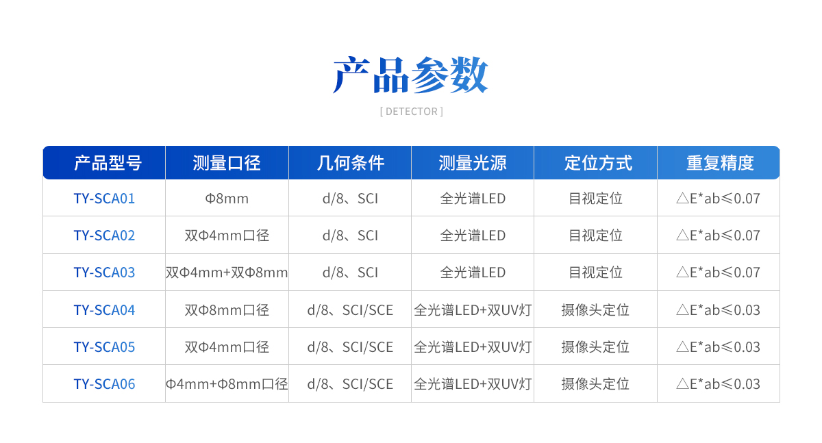 | 型號:TY-SCA01 測量口徑:Φ8mm 幾何條件:d/8、SCI 測量光源:全光譜LED 定位方式:目視定位 重復精度:△E*ab≤0.07 顏色空間:CIE-Lab、CIE-LCh、Luv、Hunter-Lab、XYZ、Yxy、sRGB、DIN LAB99、CMYK (A/T/E/M/I) 實地密度、Munsell、反射率(明視覺)、黑度、YI黃度、同色異譜(跳燈)、遮蓋力、著色力/力度/染料強度、色牢度、Taube白度、Berger白度、Tappi白度、Cros白度、Stephansen白度、甘茨白度(Ganz)、Hunter白度、白度(ASTM)、白度(CIE)、AATCC白度、R457/ISO2470白度、GB/T17644白度 色差公式:ΔE*ab、ΔE*ch、ΔE*uv、ΔE*HunterLab、ΔE*CMC(l:c)、ΔE*94、ΔE*00、ΔE*sRGB、ΔE*BFD、ΔE*FCMII、ΔE*DIN99 標準光源:A、C、D50、D55、D65、D75、F1、F2、F3、F4、F5、F6、F7、F8、F9、F10、F11、F12、CWF、U30、U35、DLF、NBF、TL83、TL84 觀察者:10°(CIE1964)/2°(CIE1931) 波長間隔:10nm 波長范圍:400nm-700nm 校準:自動 是否過計量:過計量 顯示精度:0.01 測量速度:1.0s 操作方式:電容觸屏 屏幕:3.5寸全彩液晶屏 底座:磁吸底座,自動吸附能更好嵌合主機和固定塊 電池容量:充滿電連續(xù)測量10000次 接口:Type C / 藍牙 語言:簡體中文、繁體中文、English APP平臺:Android/IOS/Windows 存儲:機身存儲標樣90條,試樣9000條,另支持App海量存儲 體積:184x93x62mm (不含底座) 重量:320g (不含底座) 物品清單:儀器機身、校準底座、 TYPE C數(shù)據(jù)線、充電器、說明書、保修卡、測量口徑2個(雙8mm口徑版)  |