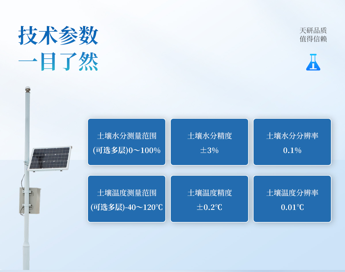 | 主控制器技術(shù)參數(shù)  數(shù)據(jù)存儲(chǔ)空間:≥100000條 記錄間隔:1分-24小時(shí)可調(diào) 數(shù)據(jù)傳輸:無線傳輸 工作環(huán)境:-30℃~80℃ 供電方式:220v市電、太陽能供電系統(tǒng)同時(shí)使用  | 傳感器技術(shù)參數(shù)  空氣濕度:0~100% 精度:±3% 分辨率:0.1% 光照 :-20~80℃ 精度:±2% 雨量 :-20~80℃ 承雨口徑:φ200mm 精度:±2% 分辨率:0.2mm 土壤水分:測量精度:±3% 工作溫度范圍:-20℃~50℃ 土壤ec:測量精度:±4% 土壤EC測量范圍:0.2~12mS/cm 土壤溫度:精度:±0.2℃ 測量范圍:-40℃~120℃  |