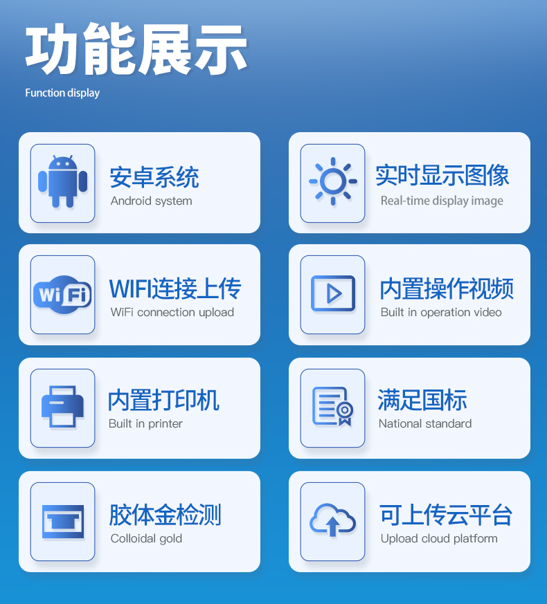 | 安卓智能操作系統(tǒng),采用更加**UI交互界面,儀器具有wifi聯(lián)網(wǎng)上傳、4G聯(lián)網(wǎng)傳輸、GPRS無(wú)線(xiàn)遠(yuǎn)傳、網(wǎng)線(xiàn)連接功能,快速批量上傳數(shù)據(jù)。 | 智能化程度高,儀器具有自檢功能:具有開(kāi)機(jī)自檢和調(diào)零功能,具有自動(dòng)檢測(cè)重復(fù)性功能。 | 新一代高速熱敏打印機(jī),檢測(cè)完成可自動(dòng)打印檢測(cè)報(bào)告和二維碼。 | 儀器帶有監(jiān)管平臺(tái),數(shù)據(jù)可局域網(wǎng)和互聯(lián)網(wǎng)數(shù)據(jù)上傳,檢測(cè)結(jié)果直接傳至食品安全監(jiān)管平臺(tái)。進(jìn)行區(qū)域食品安全監(jiān)管及大數(shù)據(jù)分析處理與數(shù)據(jù)統(tǒng)計(jì),檢測(cè)區(qū)域食品安全長(zhǎng)短期動(dòng)態(tài),達(dá)到食品安全問(wèn)題預(yù)估、預(yù)警 | 一體化便攜式快檢設(shè)備,滿(mǎn)足現(xiàn)場(chǎng)及流動(dòng)檢測(cè)使用需求,能夠在同一軟件下實(shí)現(xiàn)所有檢測(cè)項(xiàng)目的檢測(cè),并可通過(guò)同一窗口直觀(guān)顯示檢測(cè)結(jié)果。 | 膠體金模塊檢測(cè)方式:軌道式自動(dòng)傳輸掃描,檢測(cè)完成后自動(dòng)退出檢測(cè)卡。 | 一體化主機(jī),包含食品安全檢測(cè)模塊、多通道農(nóng)藥殘留檢測(cè)模塊、膠體金免疫層析檢測(cè)模塊。 | CT線(xiàn)自動(dòng)識(shí)別,無(wú)需手動(dòng)調(diào)整。 | 儀器具有品類(lèi)多種類(lèi)樣品菜單庫(kù),可靈活選擇檢測(cè)樣品,不同的檢測(cè)通道可同時(shí)檢測(cè)不同的樣品項(xiàng)目。。 | 樣品處理簡(jiǎn)單省力,整體操作快速、安全、便捷。 | 儀器具有自身保護(hù)功能,可設(shè)置用戶(hù)名及密碼,防止非工作人員操作等。 | 高靈敏度,高檢測(cè)精度,高重復(fù)性精度,掃描式高精度光學(xué)傳感器。 | 儀器具有重新校準(zhǔn)、鎖定、恢復(fù)出廠(chǎng)設(shè)置功能。 | 內(nèi)置強(qiáng)大的數(shù)據(jù)庫(kù),可在儀器上直接選擇樣品名稱(chēng)、檢測(cè)指標(biāo)、送檢單位等信息,也可在儀器上直接編輯錄入樣品名稱(chēng)、檢測(cè)指標(biāo)、送檢單位等信息并保存進(jìn)樣品數(shù)據(jù)庫(kù)。 | 儀器具有重新校準(zhǔn)、鎖定、恢復(fù)出廠(chǎng)設(shè)置功能。 | 結(jié)果判定線(xiàn)可修改,對(duì)照值標(biāo)定值可保存,斷電不丟失數(shù)據(jù)。 | 兼容市場(chǎng)上所有的膠體金卡,使用耗材不受限制,極大增強(qiáng)用戶(hù)使用體驗(yàn)。 |