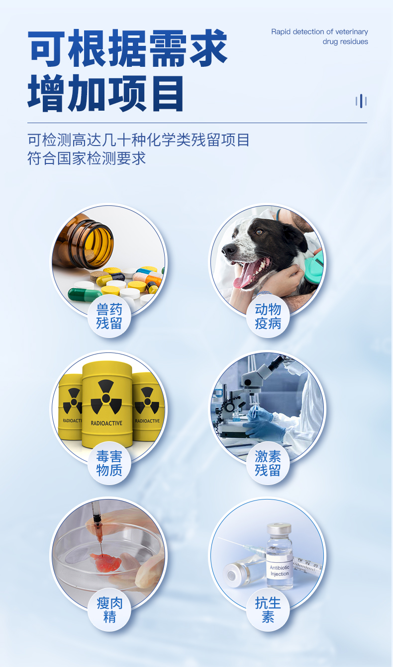 | 瘦肉精激素類(lèi)(獸藥):鹽酸克倫特羅、沙丁胺醇、萊克多巴胺、己烯雌酚、喹乙醇等 | 抗生素殘留類(lèi)(獸藥):四環(huán)素類(lèi)、硝基呋喃類(lèi)、磺胺類(lèi)、沙星類(lèi)、喹諾酮類(lèi)、慶大霉素、鏈霉素、阿莫西林、紅霉素等 | 水產(chǎn)品安全類(lèi):孔雀石綠、氯霉素、呋喃妥因代謝、呋喃西林代謝、呋喃它酮代謝、呋喃唑酮代謝等 | 以及病害肉及肉類(lèi)新鮮度的擴(kuò)展檢測(cè)。 |
